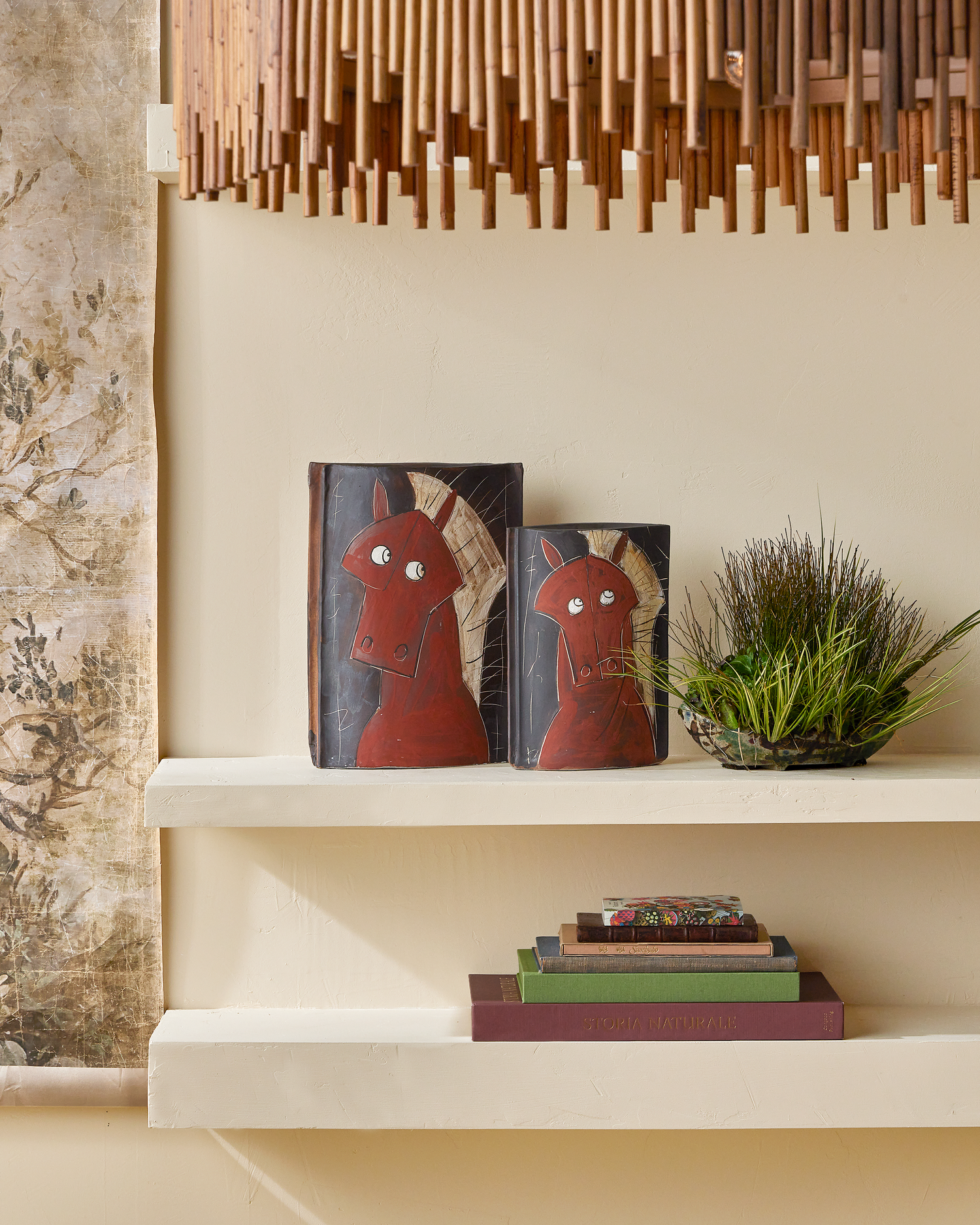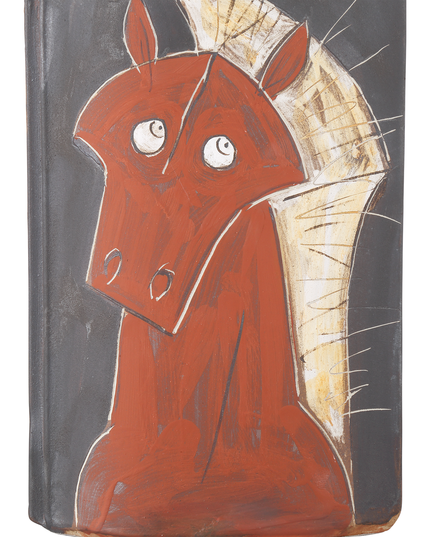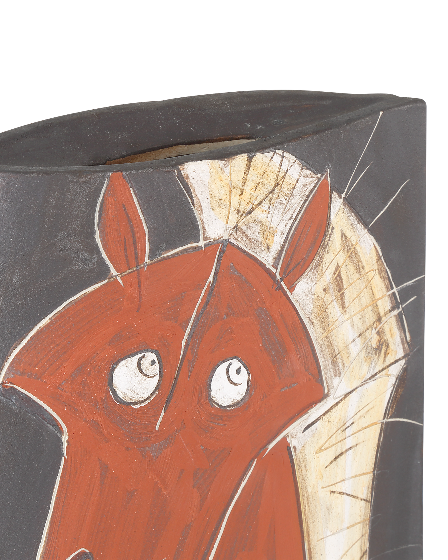 Description: With a whimsical motif that could have been drawn by a child or by Picasso, the Artistic Horse Large Vase is made of porcelain in a mix of red, black, and off-white hues. The irregular shape of the vase, which resembles a pinched oval, and the fact the top is not hollow but has a smaller opening than would be expected are surprises of the design of this black vase.