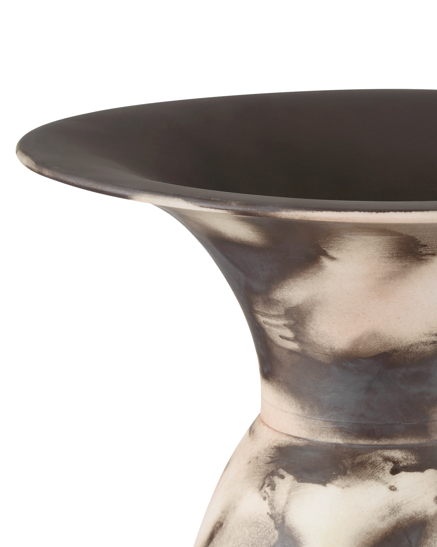 Description: You'll want to see the Celestial Vase from every angle, as a different pattern will come into view depending upon the direction from which it is seen. Made of porcelain, the morphing patterns hold hints of black, pale green, and pale red hues. This is a hand-thrown creation with motifs that could easily represent the whole of the cosmic universe.