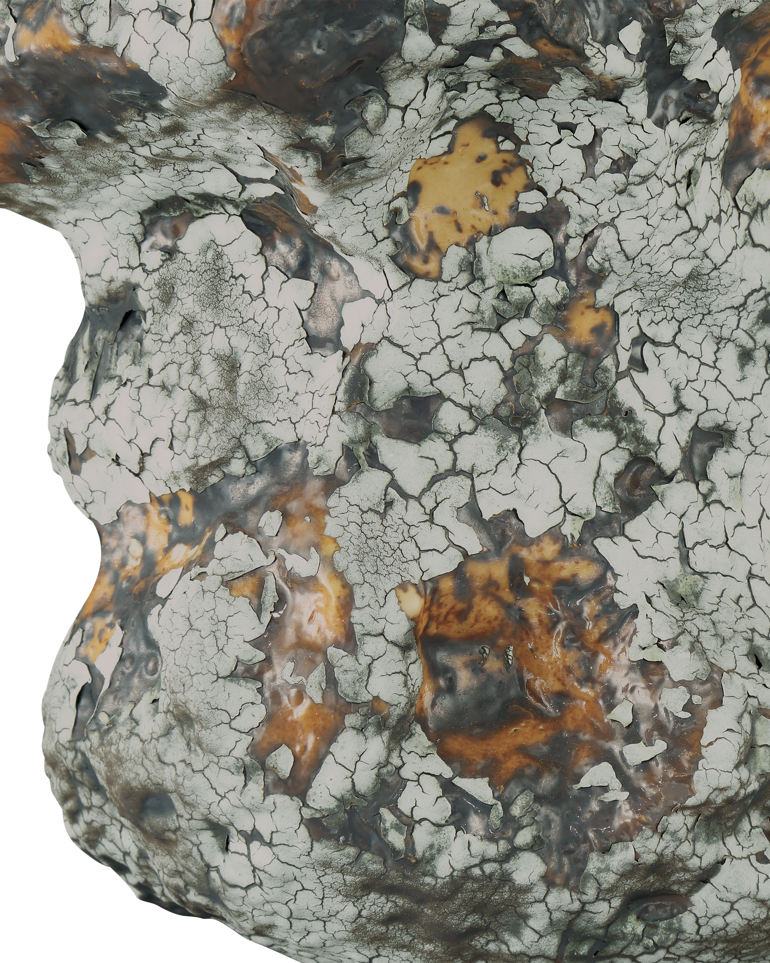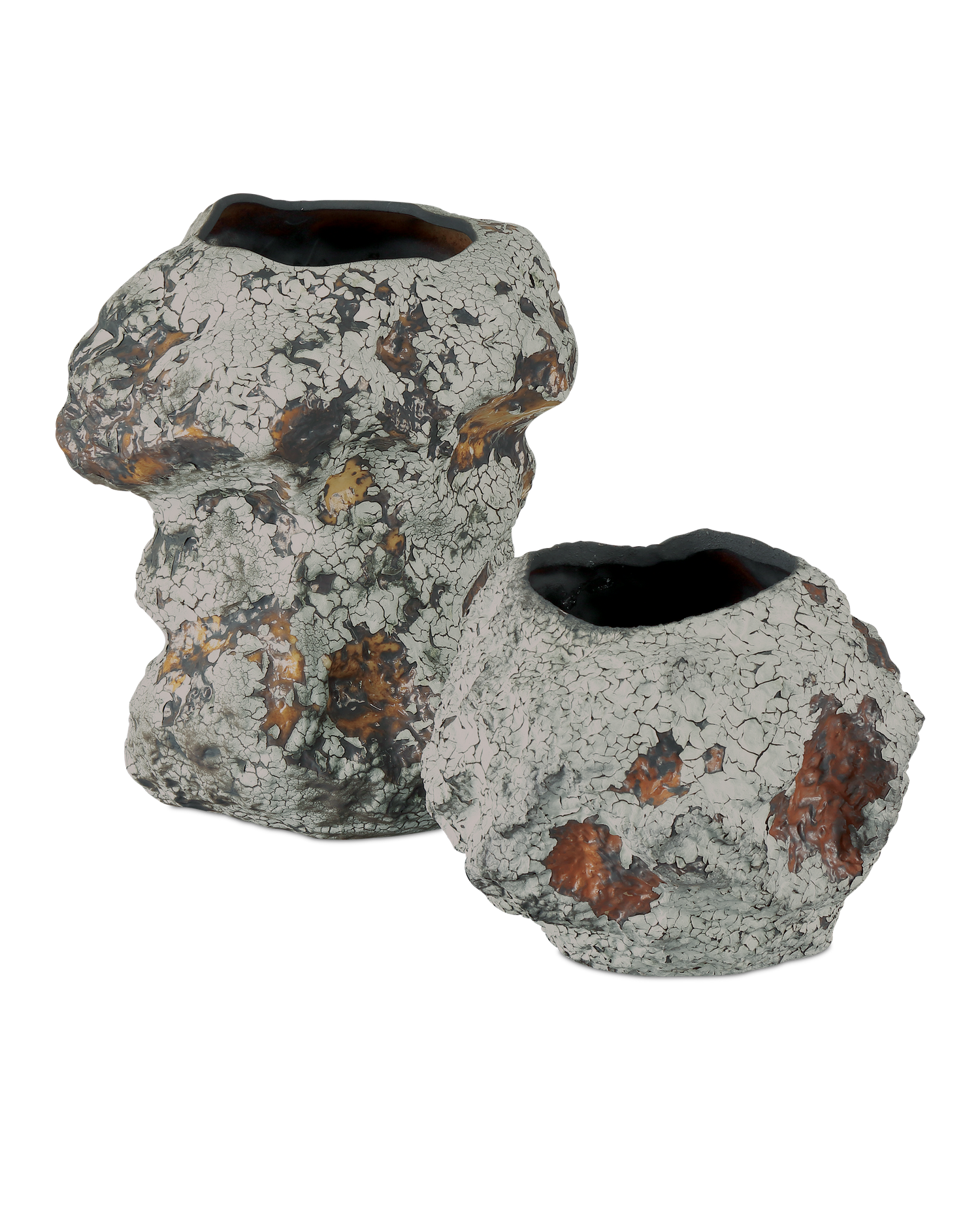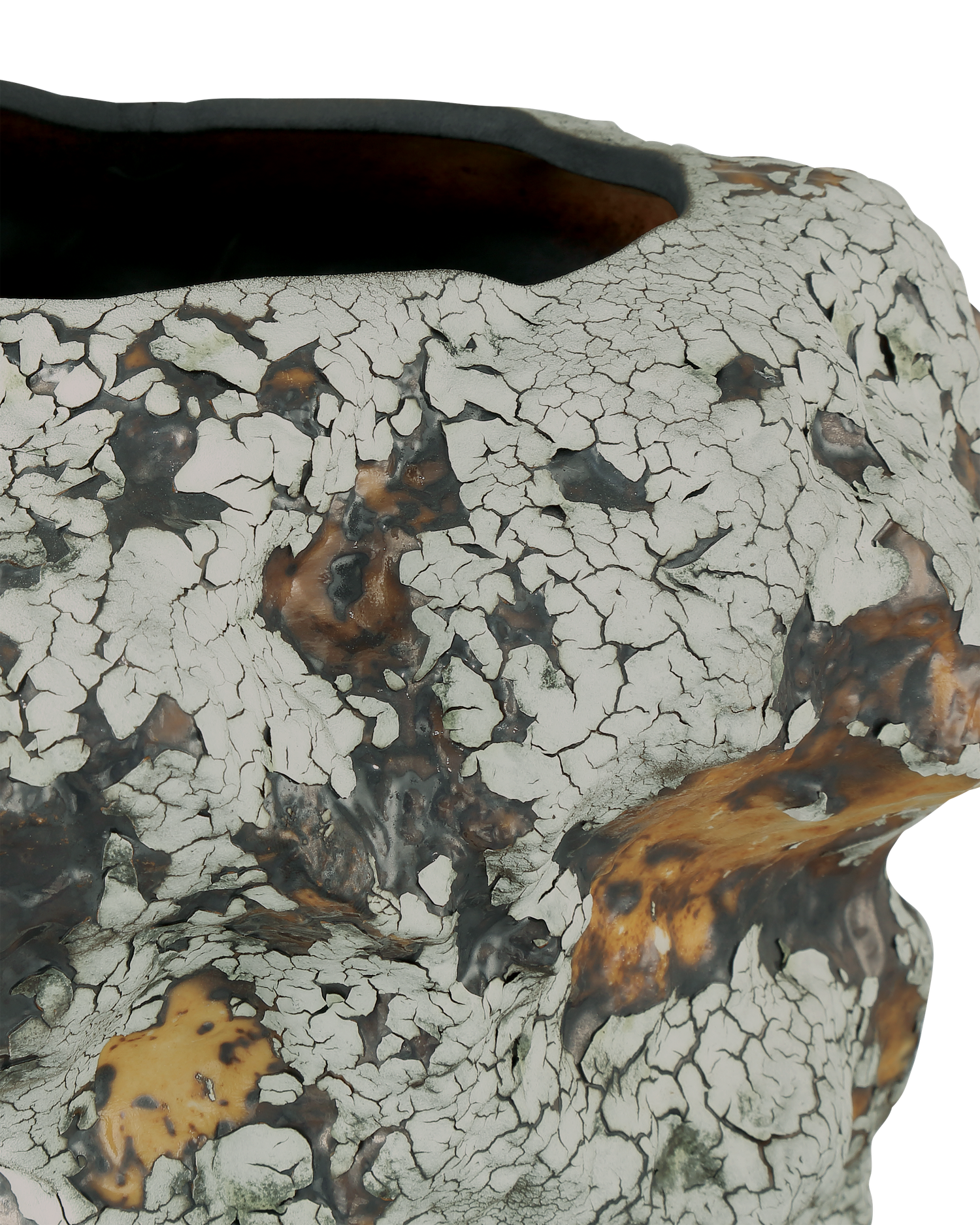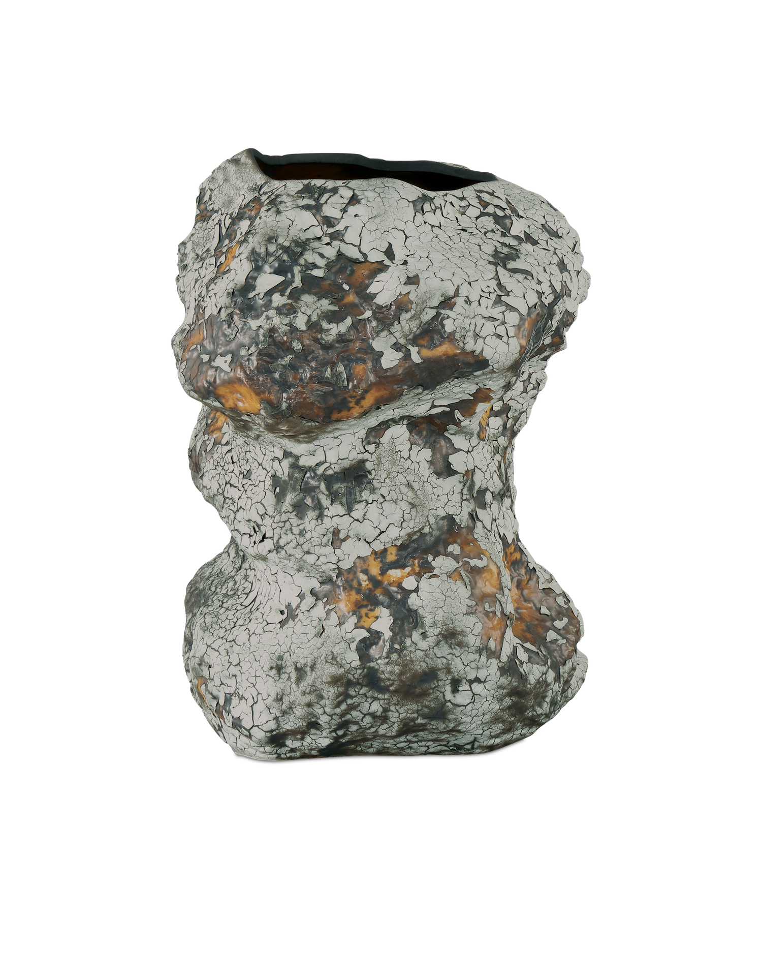 Description: Part ragged tree-bark, part meteorite, the Grotesque Large Vase is a wonder to behold. The remarkably irregular shape of this porcelain vase is accentuated by the super rough surface that looks as if it has been burned or frozen, or both. Hand-thrown, hand-glazed, and hand-decorated, the artisanal qualities of this burnt-orange and off-white vessel cannot be overstated because each one is truly unique, as any authentic work of art must be.