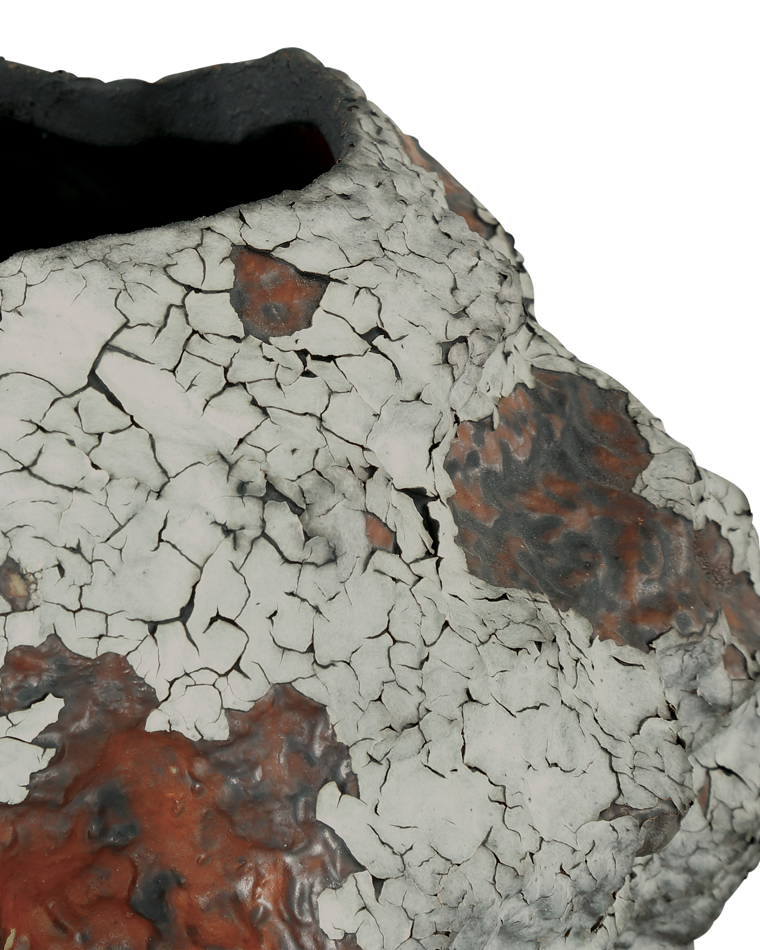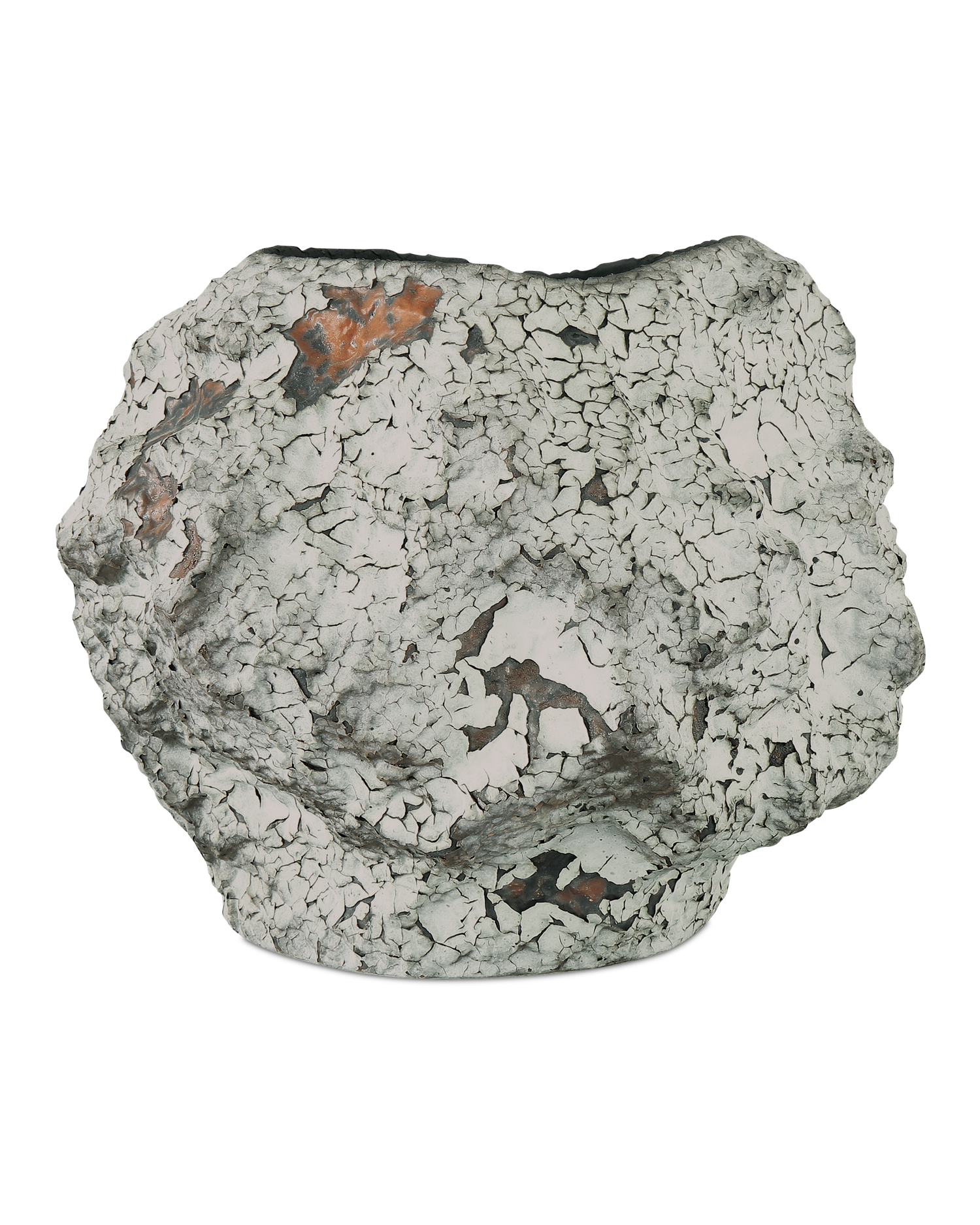 Description: Part ragged tree-bark, part meteorite, the Grotesque Medium Vase is a wonder to behold. The remarkably irregular shape of this porcelain vase is accentuated by the super rough surface that looks as if it has been burned or frozen, or both. Hand-thrown, hand-glazed, and hand-decorated, the artisanal qualities of this burnt-orange and off-white vessel cannot be overstated because each one is truly unique, as any authentic work of art must be.
