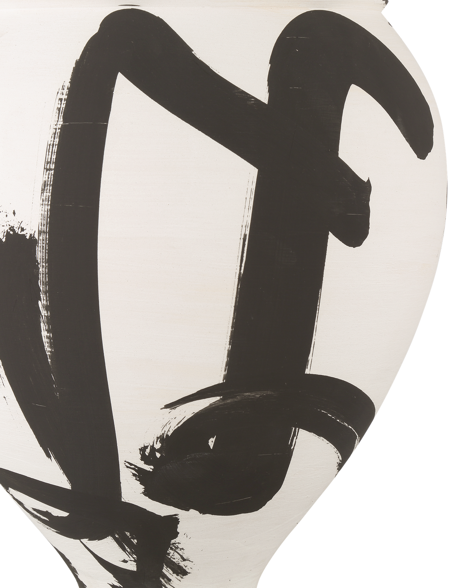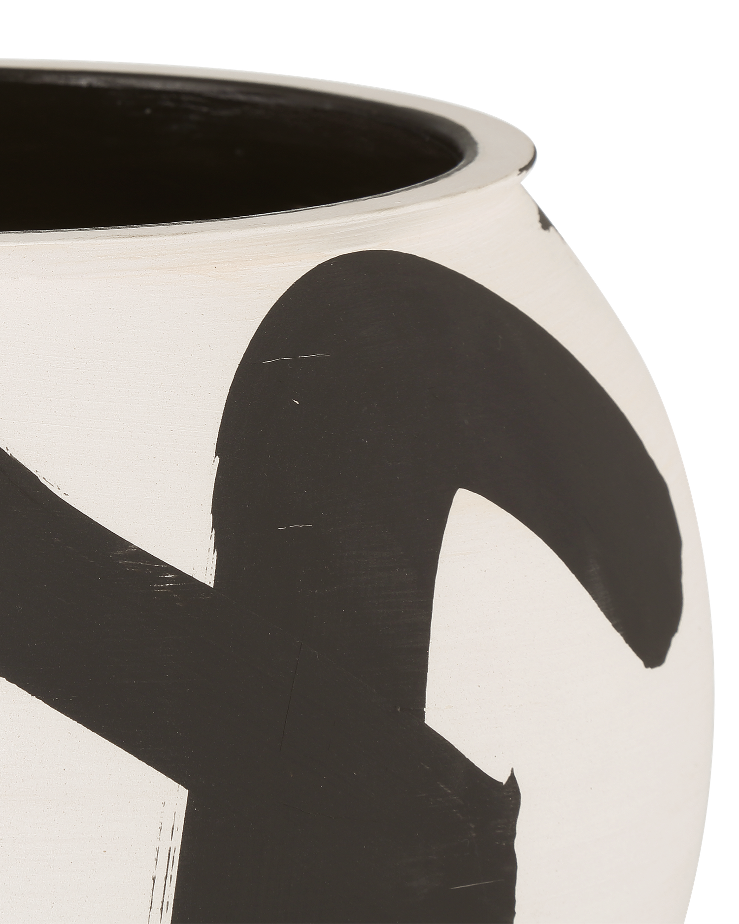 Description: The sketched pattern on the surface of the Kenzo Medium Vase was inspired by the art of Imperial Japan, particularly the Enso, a prolific symbol in the Zen practice of painting. Made of porcelain, the black and off-white vessel is finished on the inside; and it is hand-thrown, hand-glazed, and hand-decorated so the patterns on each vase will vary slightly.