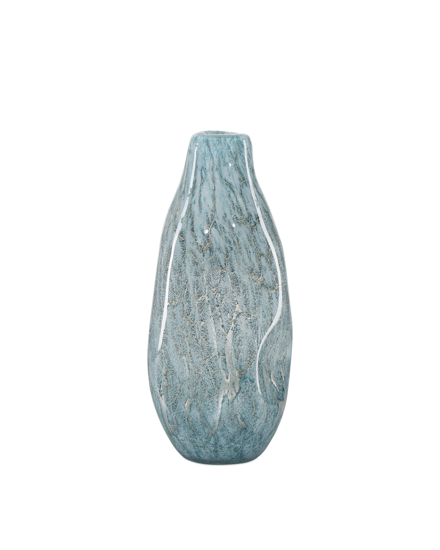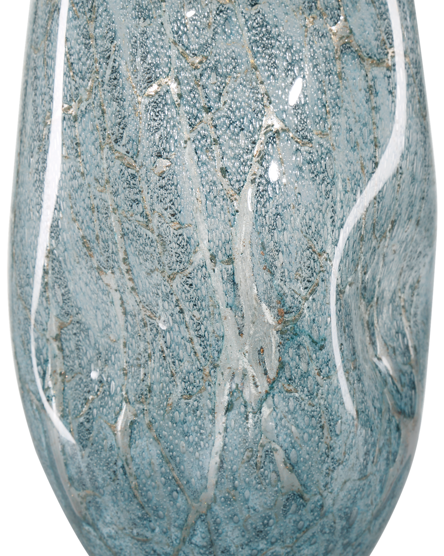 Description: The Tyne Medium Vase is made of mouth-blown glass that has remarkable depth to it because the surface is swimming with blue bubbles, flecks of black and swirls of gold metallic. These details enliven each vase with a textural complexity and enhance its gleam. The thickness of the glass from which this blue vase is made speaks to the high quality of the decorative accessory.