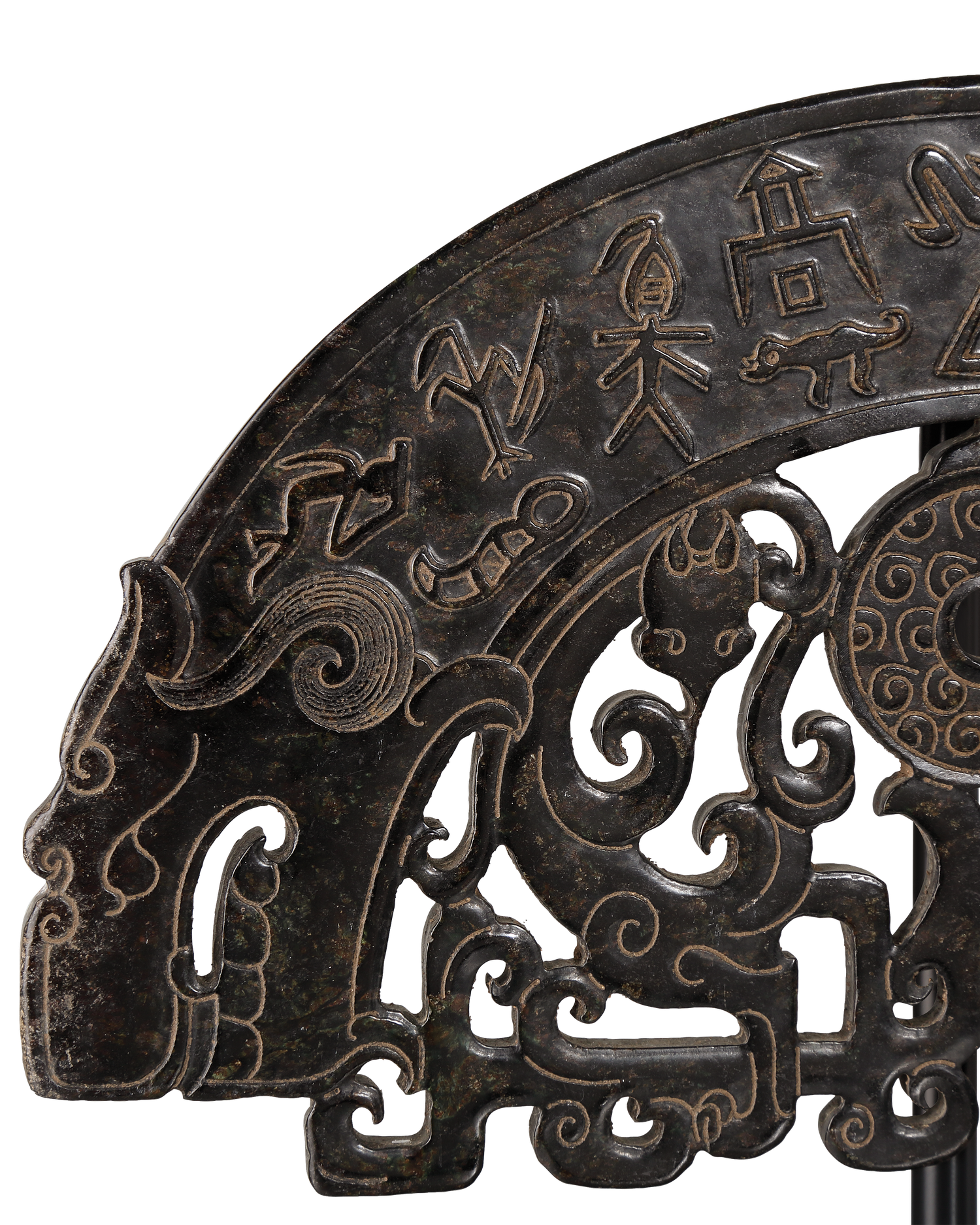 Description: The Han Dynasty Jade Jewel, which is made of a bronze-colored stoneware, emulates a famed jade carving and sits atop a metal stand in a black finish. The profile represents how important jewels were to women during the great Chinese dynasties; this particular piece worn on the chest. The name of this rich brown sculpture reflects that it is made in a Han Dynasty style, and it is carved on the front and the back.
