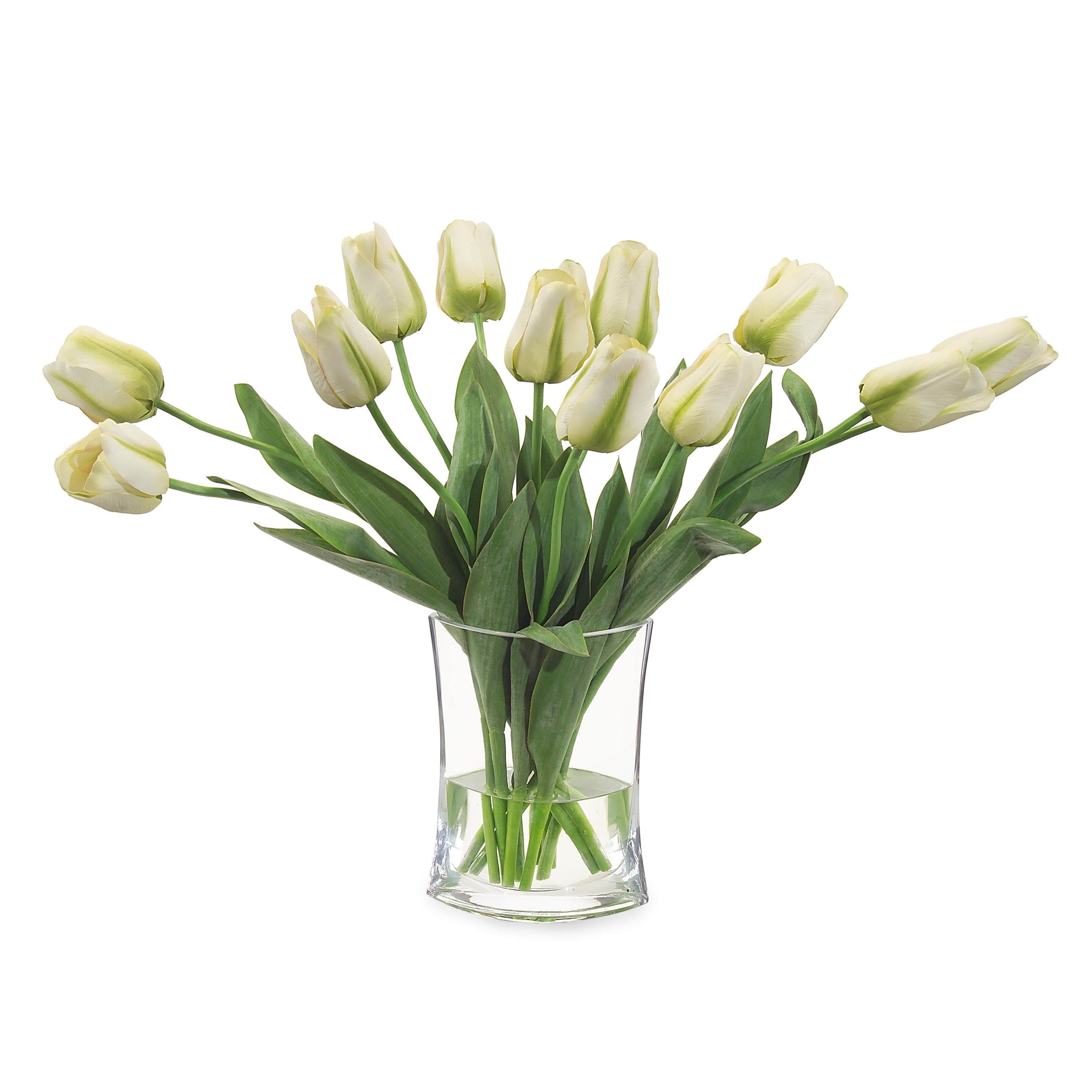 Description: A bouquet of Dutch tulips in a clear, concave vase and faux water.