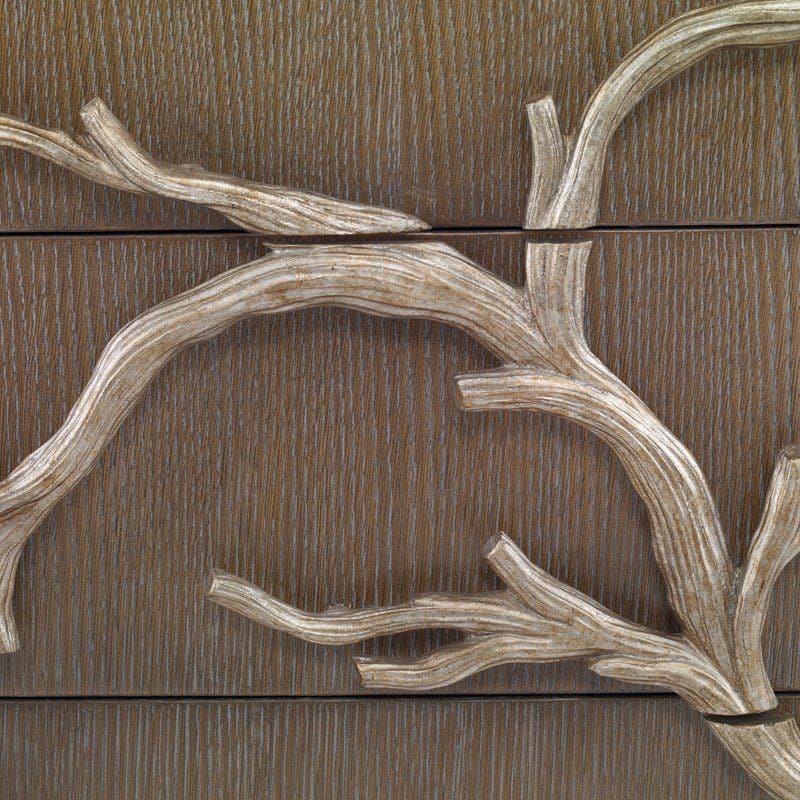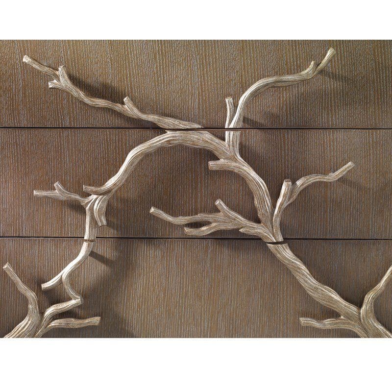 Made of Mindi wood with Oak veneer. A dramatic cast tree branch creates the legs and drawer pulls on this stunning sink chest. The warm wood finish complements the silver Travertine stone top. Two working drawers. Balsa porcelain sink bowl included.