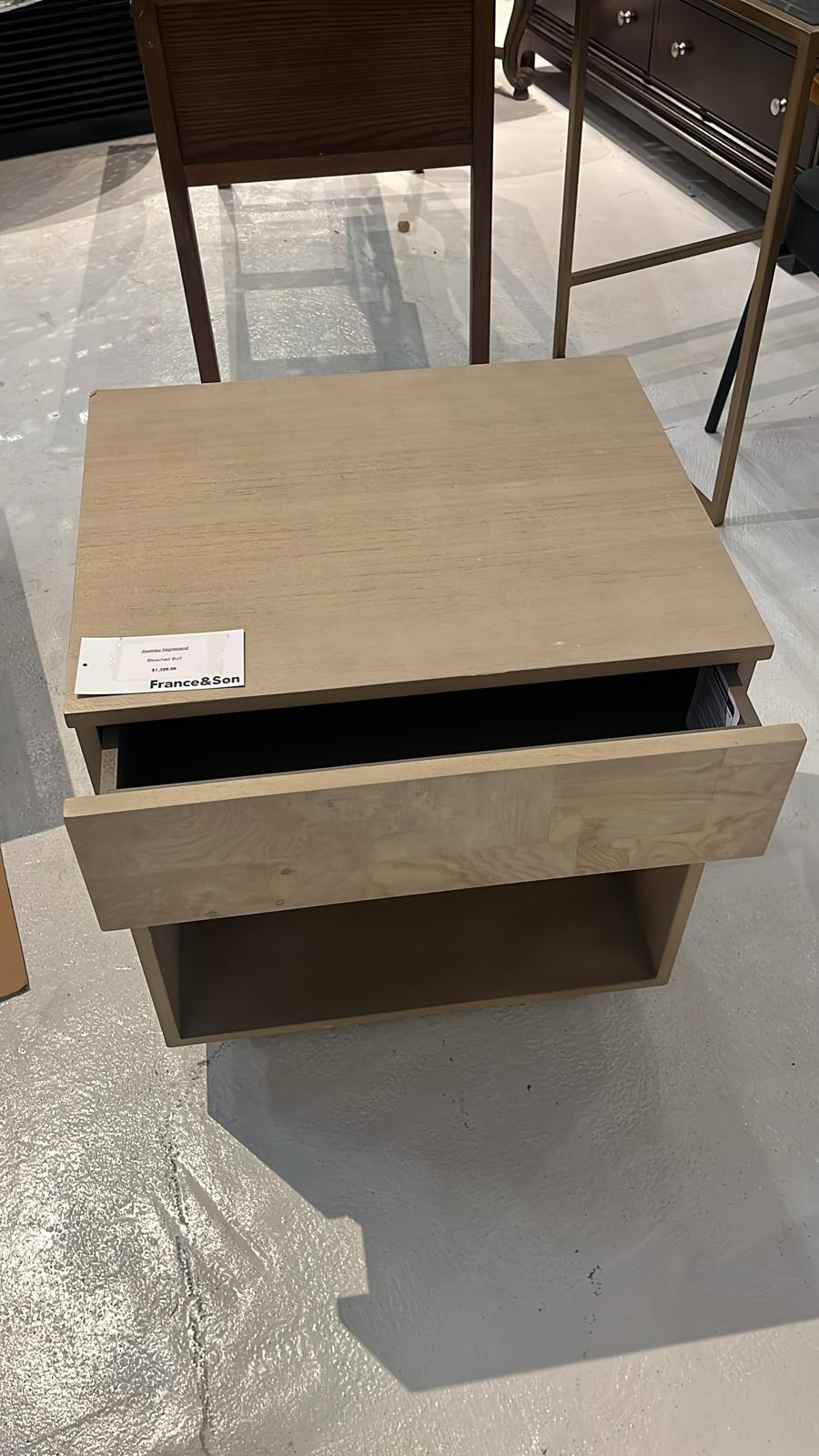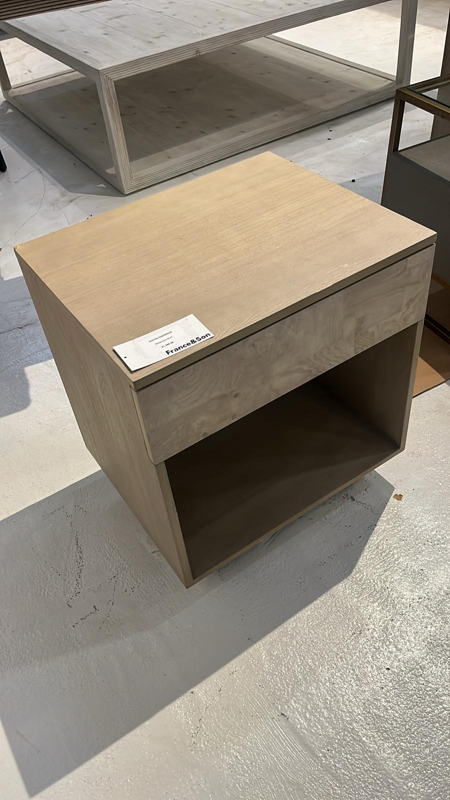 Description: A stunning statement piece. Atop a squared plinth base, white-finished mahogany encases a spacious single drawer of bleached burl with organic patchwork, cut and placed by hand. Push-latch open for a clean, seamless look. Each piece unique.
