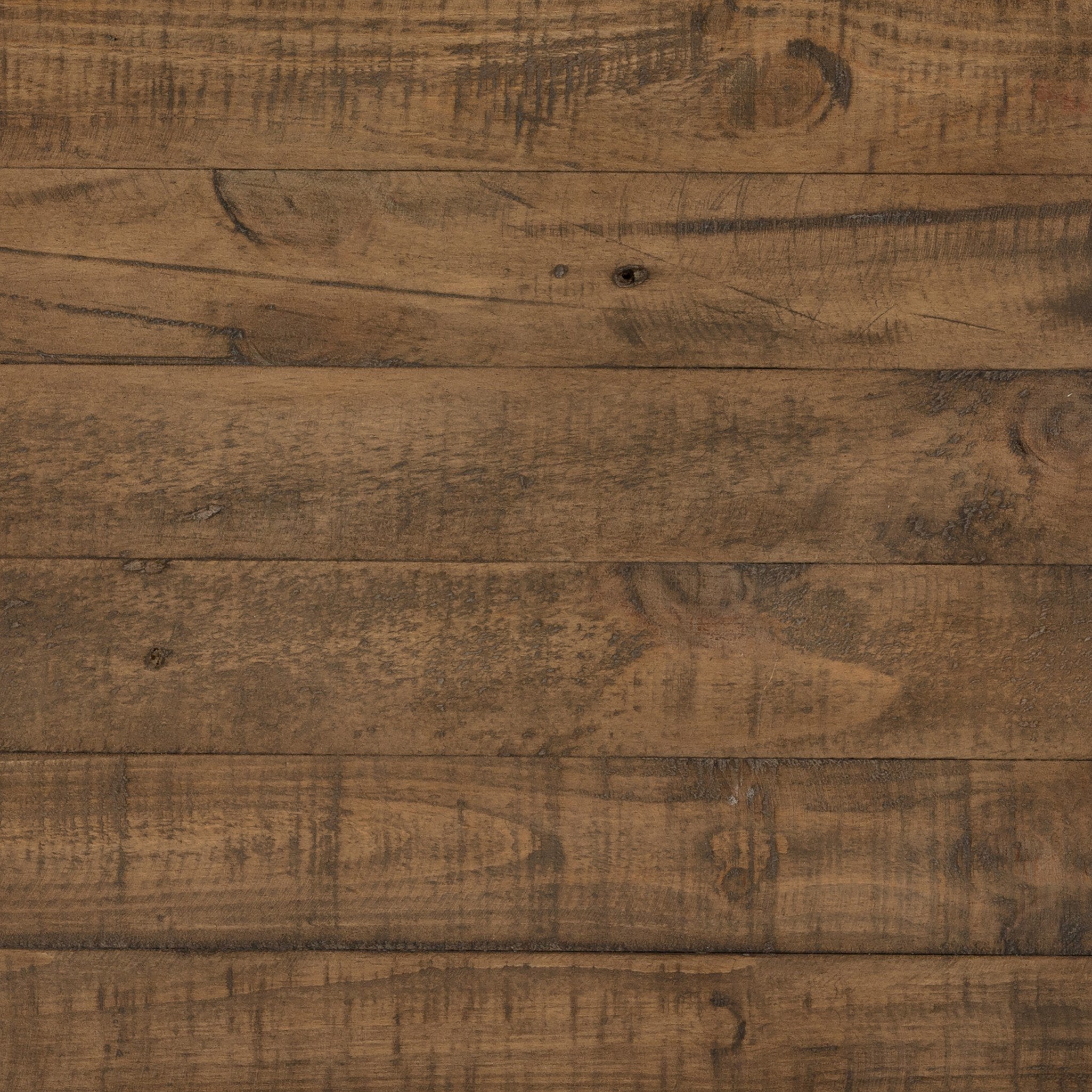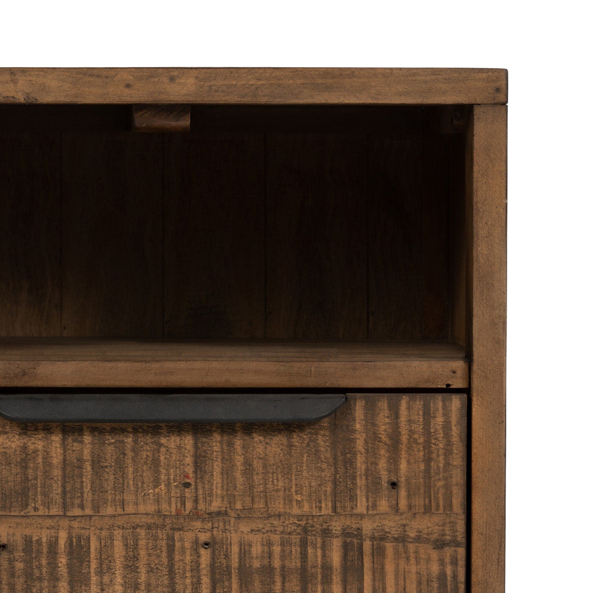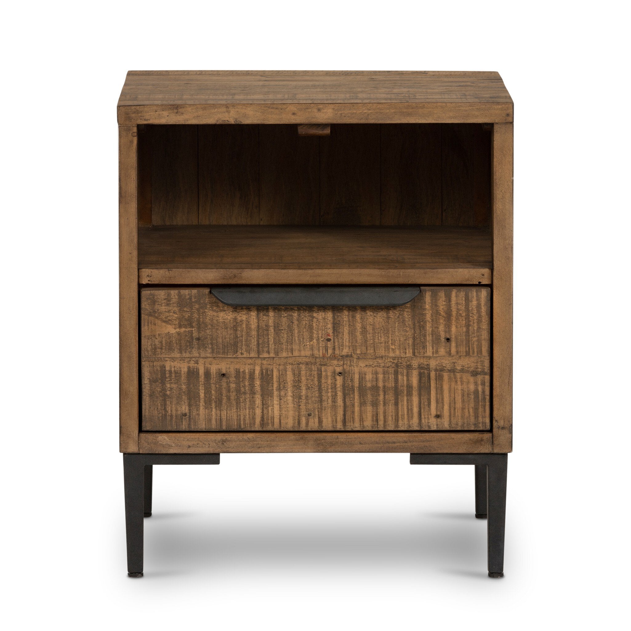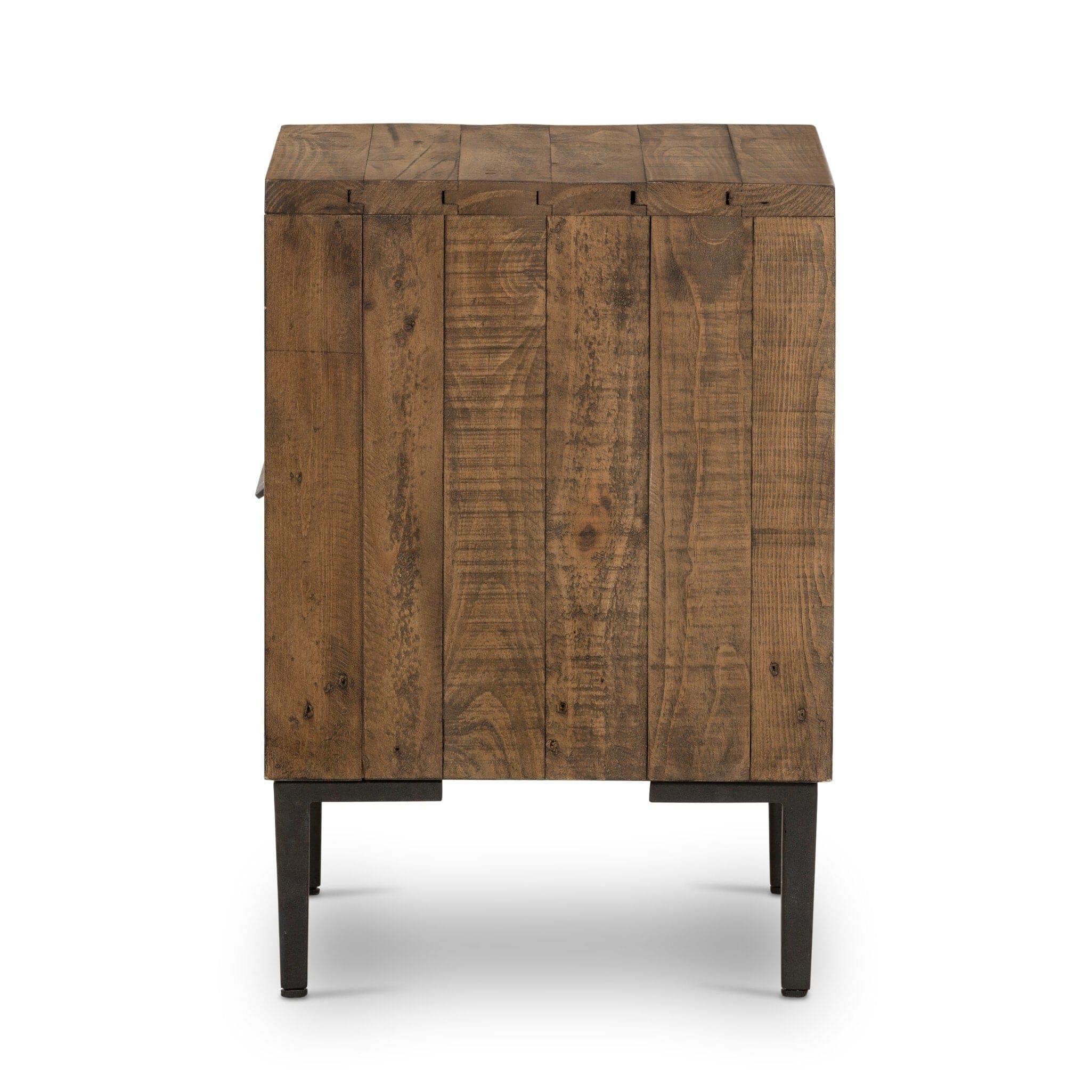 - Description: Finished in a rustic sandalwood, solid reclaimed pine flaunts its natural graining, with flat, gunmetal-finished iron hardware accentuating a spacious single drawer, ideal for handy bedside storage.