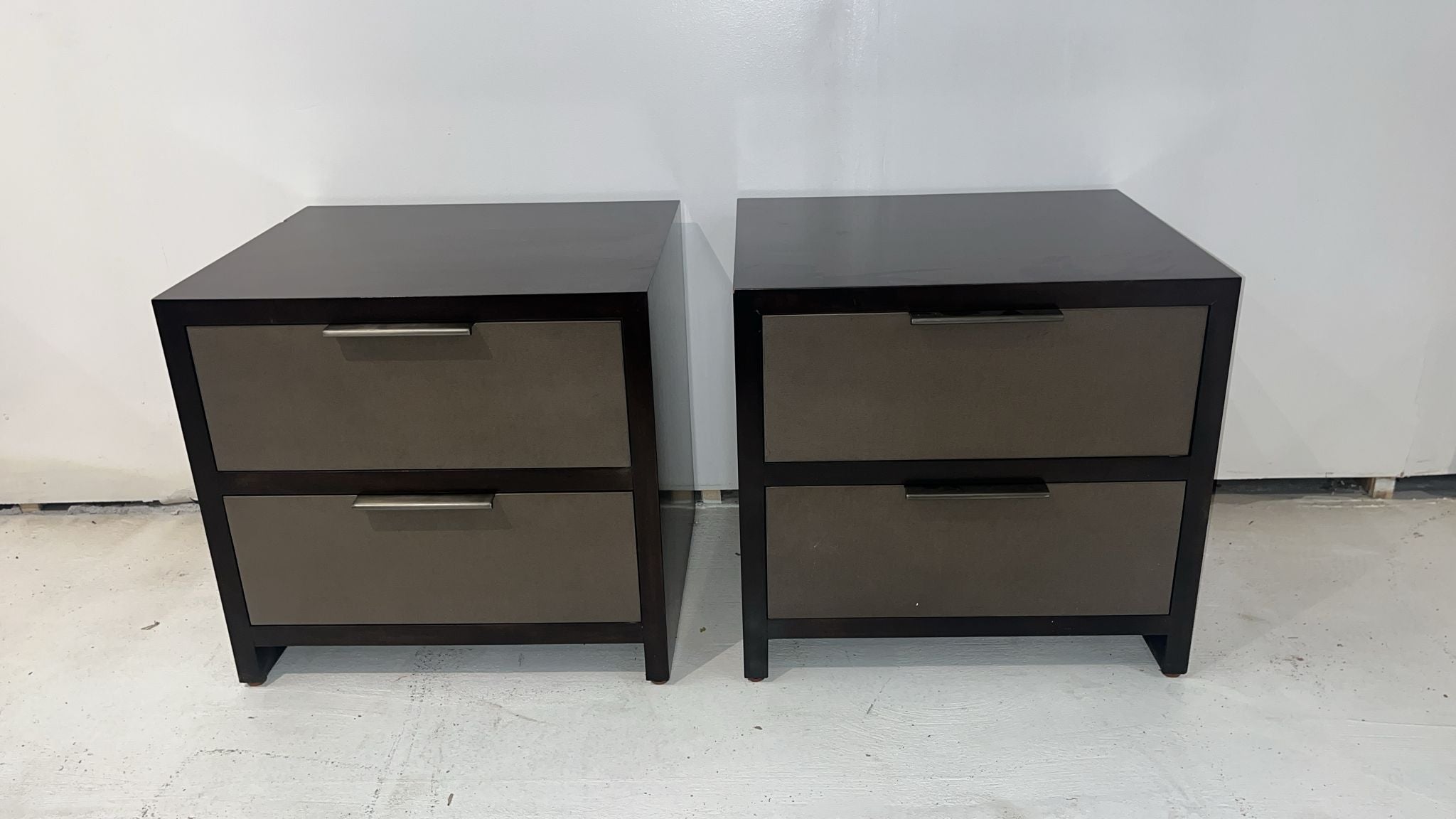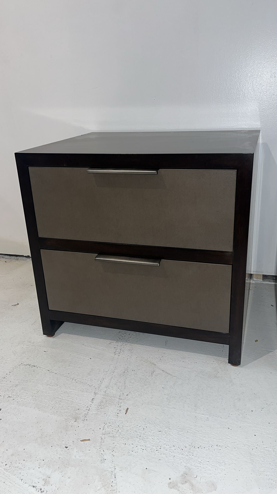 Cherry Veneered with Almond Finish Two Singular Grey Leather Wrapped Drawers Brushed Pyrite Finish Handles