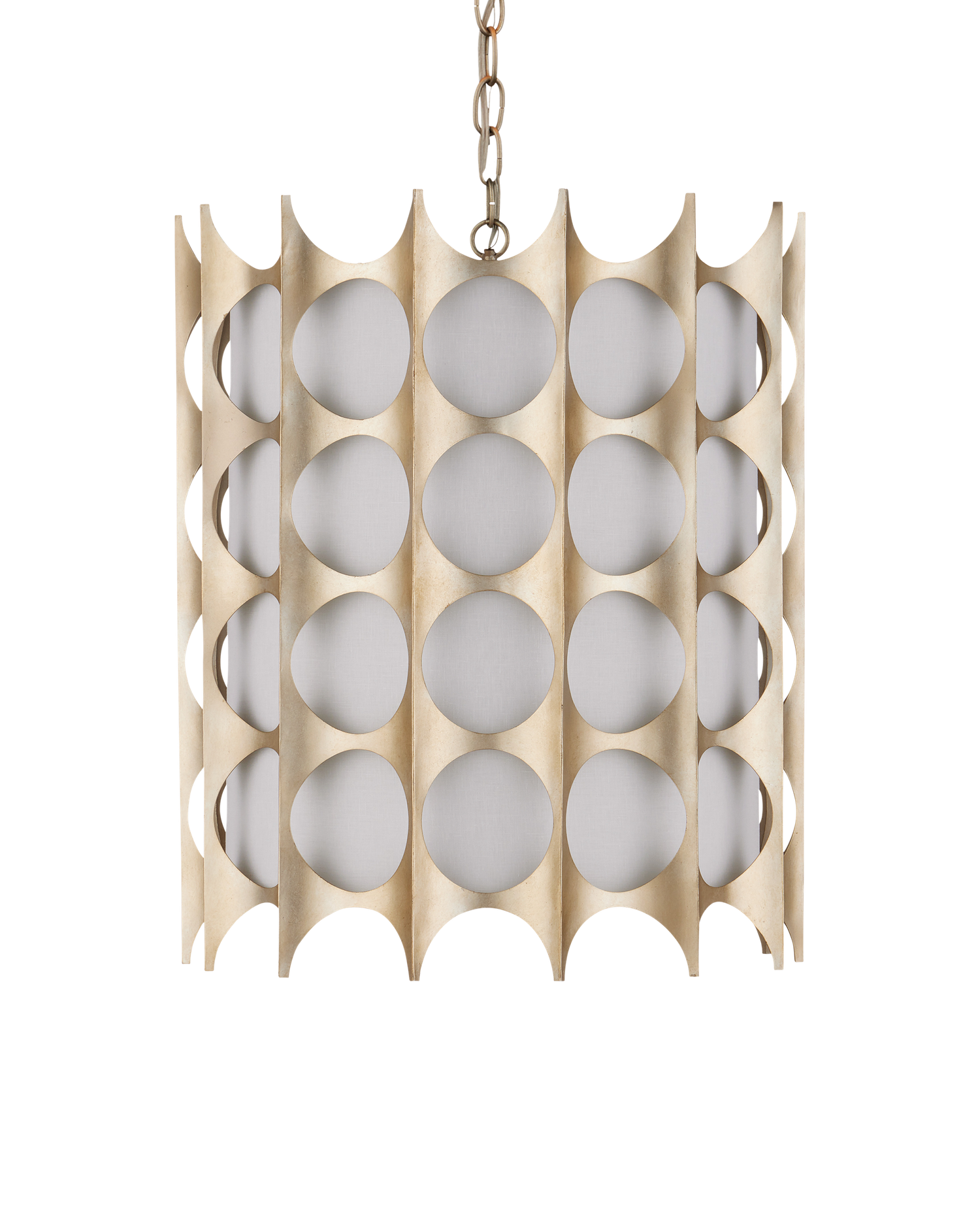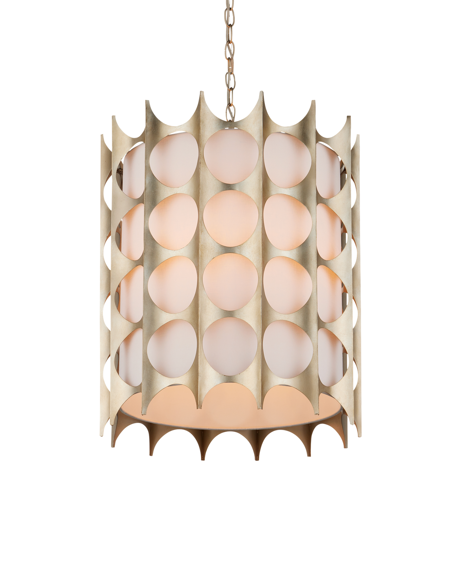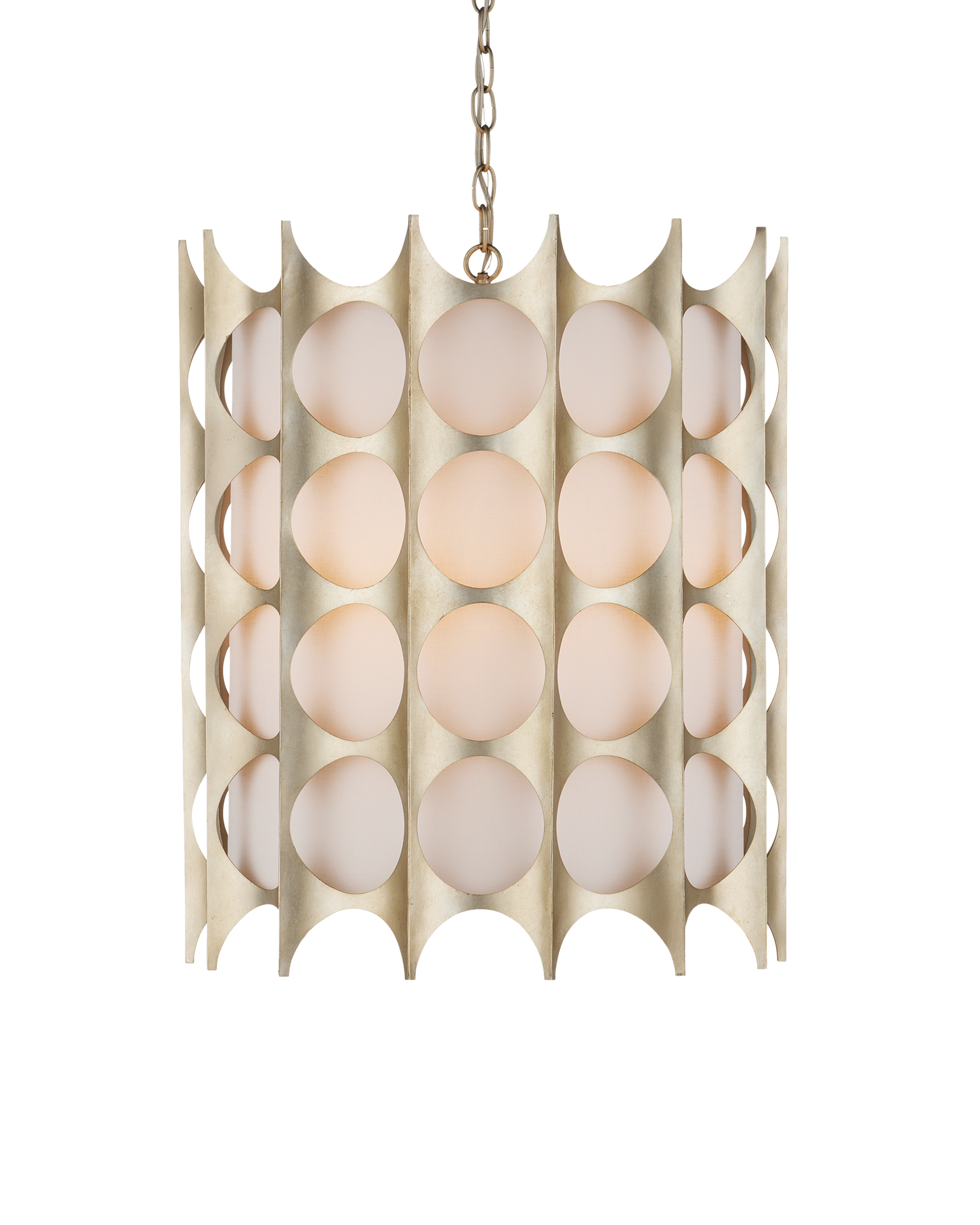 Description: The Bardi Pendant is an engineered marvel. The laser-cut sheets of metal are bent and welded in place, then finished in a contemporary silver leaf that gleams. The dramatic construct is then fitted over a white linen shade that makes the illumination from the silver chandelier glow. Adjustable from 30" to 98" with use of included chain/rod kit/cable. If your space calls for a longer drop, additional chain/rods/cable is available for purchase.