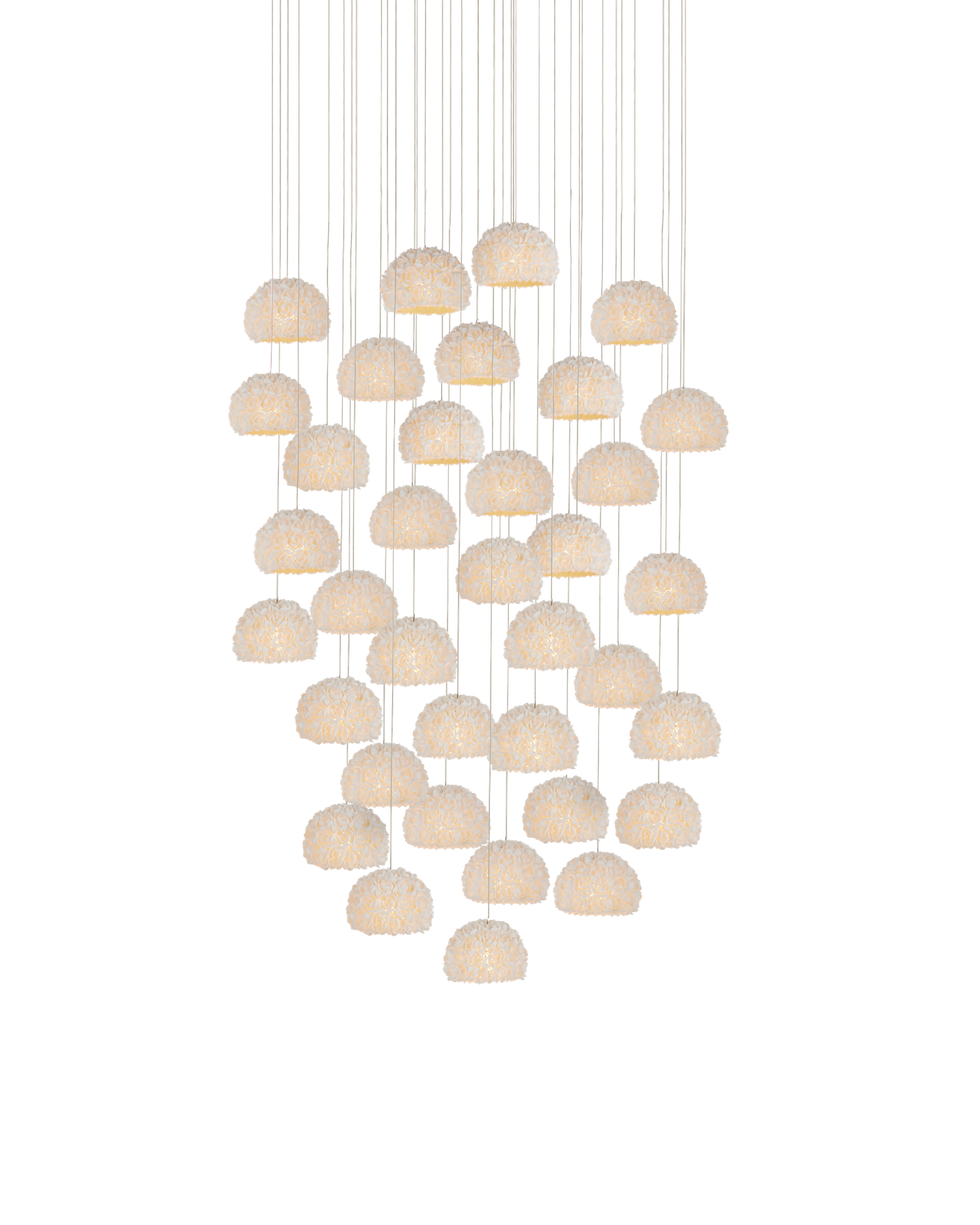 Description: The Virtu 36-Light Round Multi-Drop Pendant has beautifully composed shades around which clamrose shells are fashioned to look like rosebuds; each petal hand-placed to make this an artisanal offering. The way the illumination wafts through the shade and surrounds the shells is a design detail of note with this lovely nature-inspired luminary.