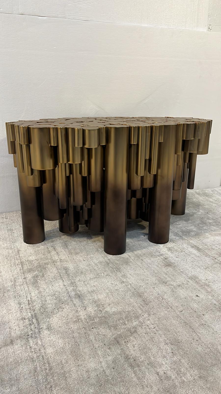 This unique coffee table base will be an eye-catching centerpiece in any living space. Stainless steel rods of varying lengths make up the fascinating base. The brushed gold ombre finish adds even more depth to this already visually appealing piece. This piece will work great in a variety of decors.