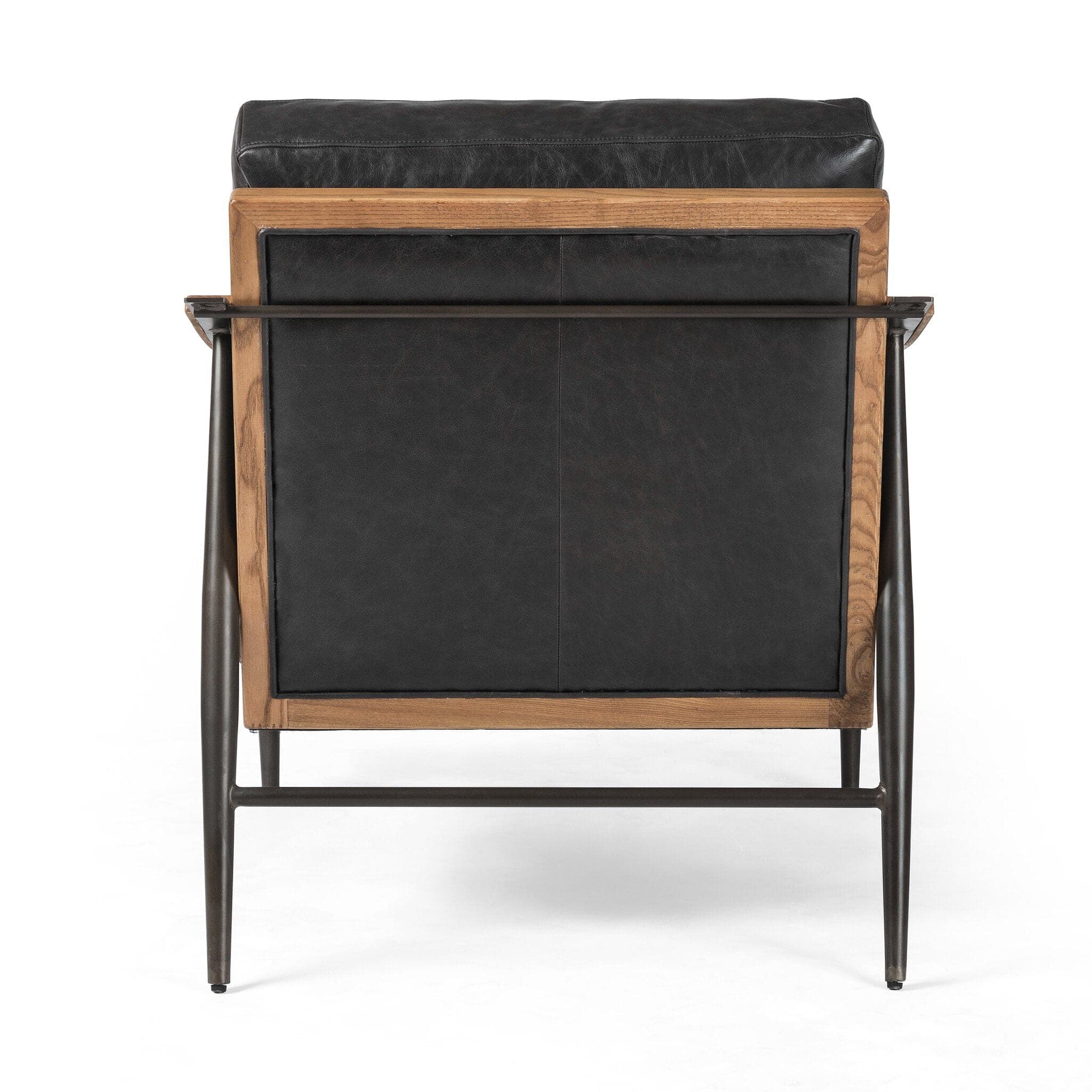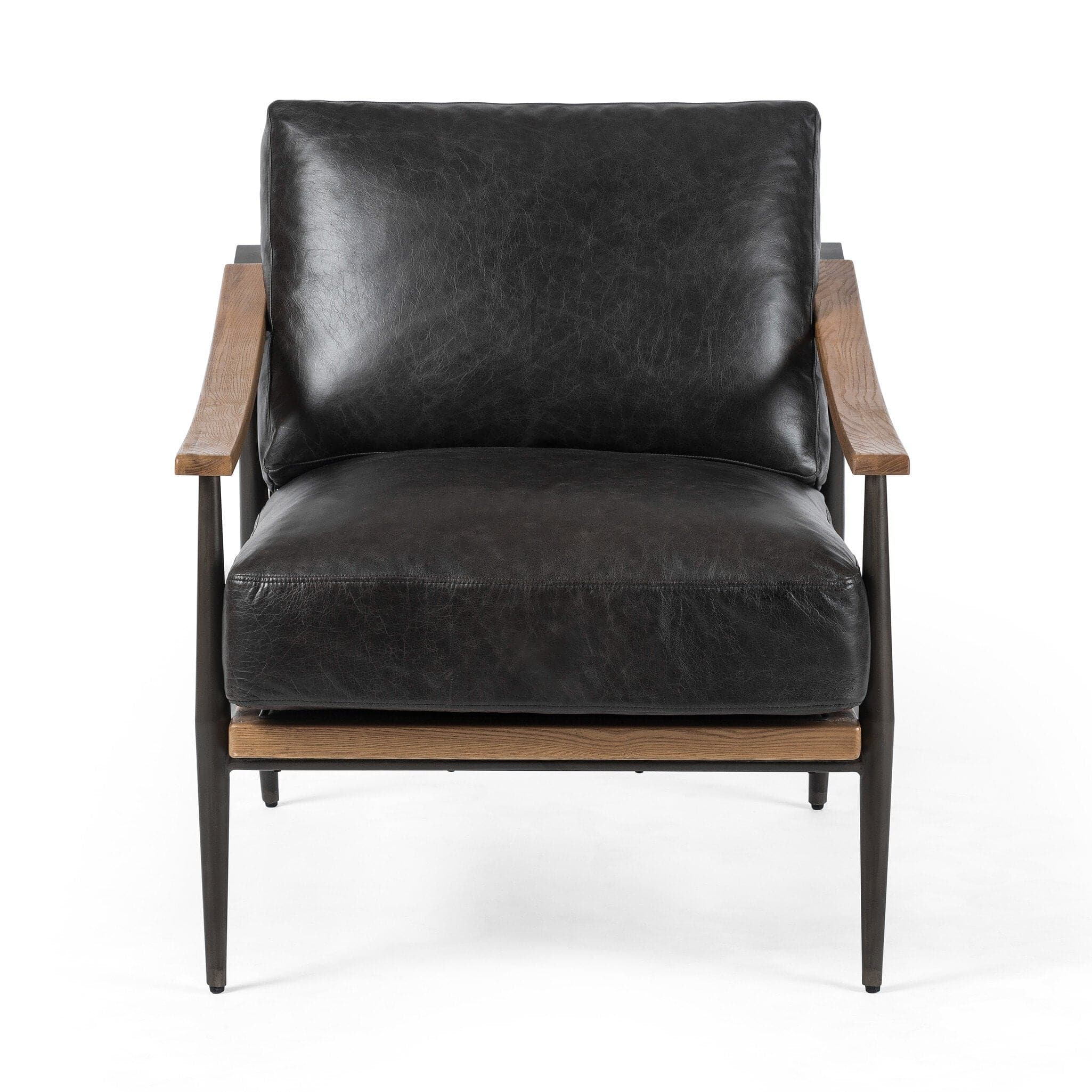 - Description: Comfort and class in one chic silhouette. Sloped wooden arms and forged, gunmetal-finished legs frame our Four Hands exclusive top-grain leather with slight distressing for a subtle worn-in look and feel.