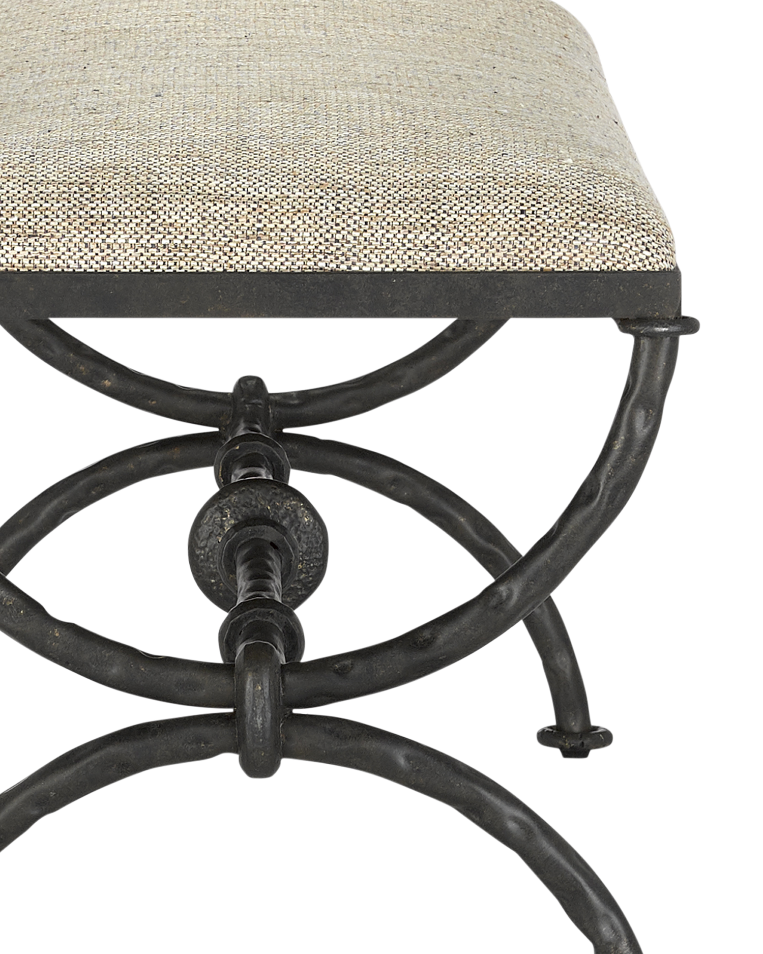 Description: The curvaceous sides and the ornamented stretcher of the Agora Bronze Bench are made of iron in a rustic bronze finish. The upholstered top, covered in a Calcutta Peppercorn fabric softens the profile of the black bench.