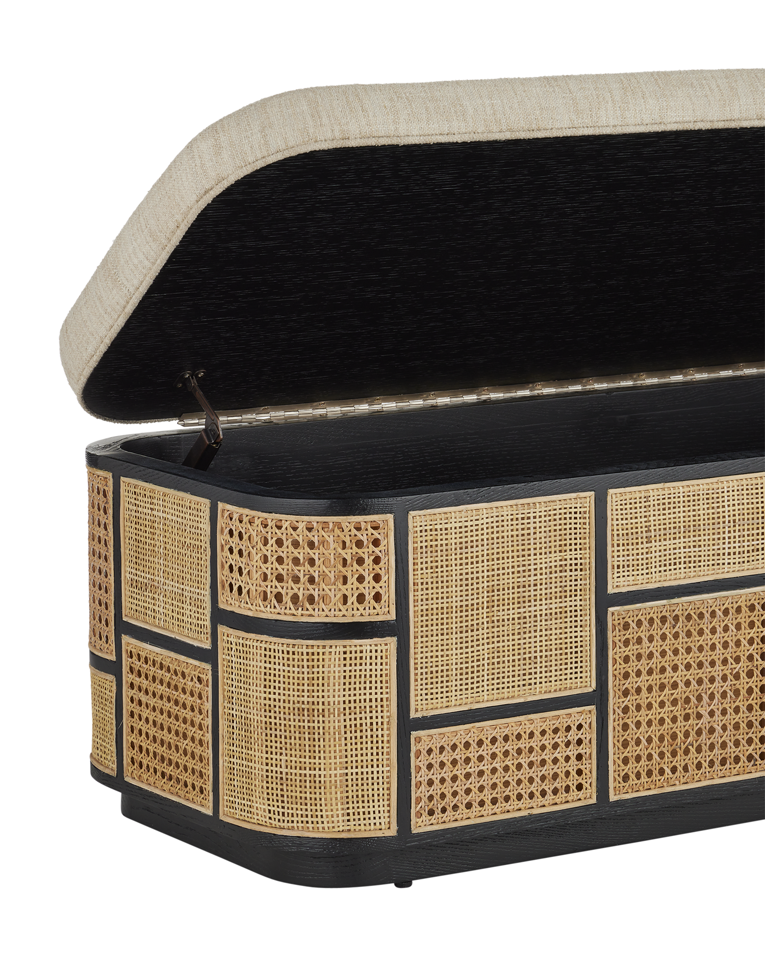Description: The Anisa Black Storage Bench, covered in Trailside Natural Instinct Safari fabric, combines several weaving techniques. The natural oak form in caviar black finish is fitted with rattan cane panels, while the larger rattan sections are done in a radio weave and the smaller ones in an open weave. Not only does this mix it up texturally, it adds interest to this piece that was designed by Aimee Kurzner. The parchment-colored seat and the plinth base on which it sits places this firmly in a natural and black style story. The generous size of the storage area will make it a favorite go-to spot for storing linens, toys or other accessories.