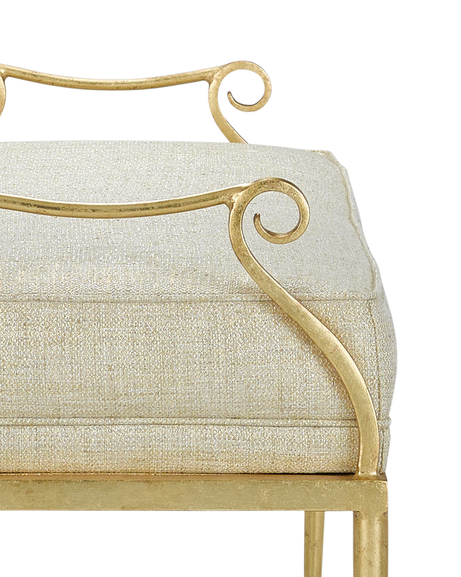 Description: The frame of the Genevieve Gold Bench is finished in rich Grecian gold that illuminates its legs and distinctive side flourishes reminiscent of Egyptian hieroglyphic symbology. The upholstered seat of the Genevieve is shown here in Sequin Gold Dust fabric, which is made of 100 percent polyester.