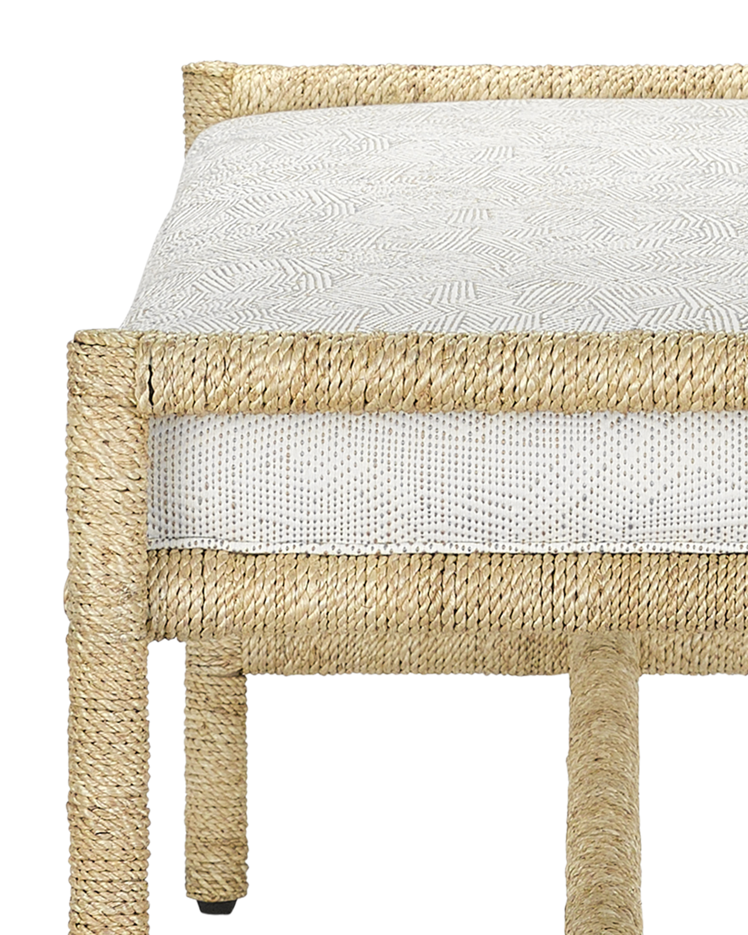 Description: With the earthy feel of rattan and wicker but with a much heavier dose of personality, the Olisa Natural Bench is a wrap star! Made of wrought iron that is covered in braided Abaca rope. This rattan bench is upholstered in Rowann Pearl fabric, which is made of 40 percent rayon, 33 percent cotton, 25 percent polyester and 1 percent nylon.