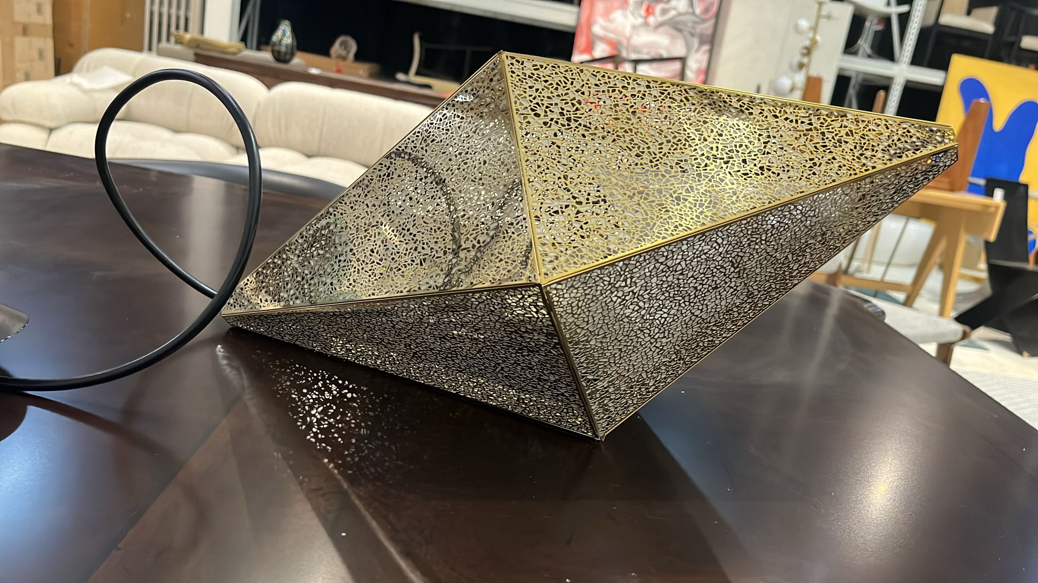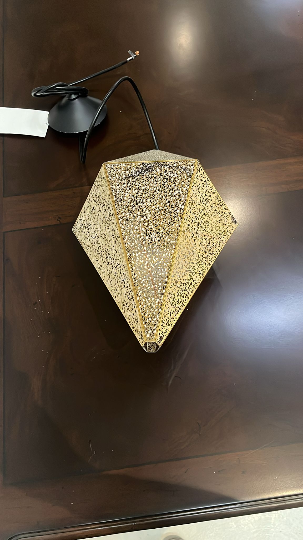 This beautiful hanging pendant will add an elegant touch to any space. The stainless steel frame holds twelve triangular stainless steel panels that form a diamond-like shape. Each panel is etched into a beautiful pattern that allows the interior bulb to shine through. The steel has been given a gold finish that lets this piece really sparkle and shine while illuminating your room. A standard 40 watt bulb will provide plenty of ambient lighting.