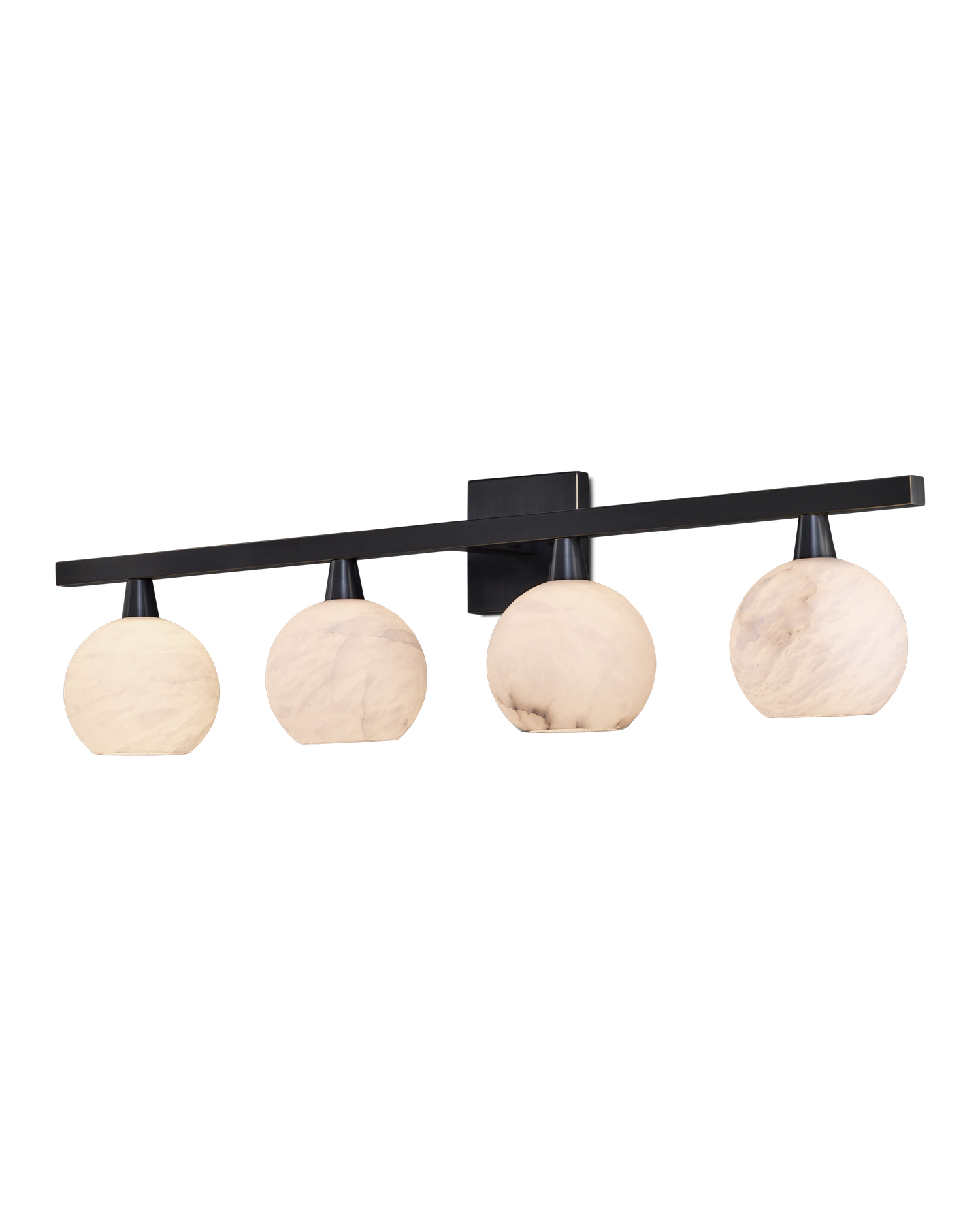 Description: The Bombelles Bronze Bath Bar was designed to spread abundant light over a bathroom counter, the fixture joining others in the Bath Collection. The globes will be luminous when they are lit, as they are made of natural alabaster, and the oil-rubbed bronze finish on the metal adds warmth to the design. Alabster is a natural material, so there will be slight variations in each of the fixtures.