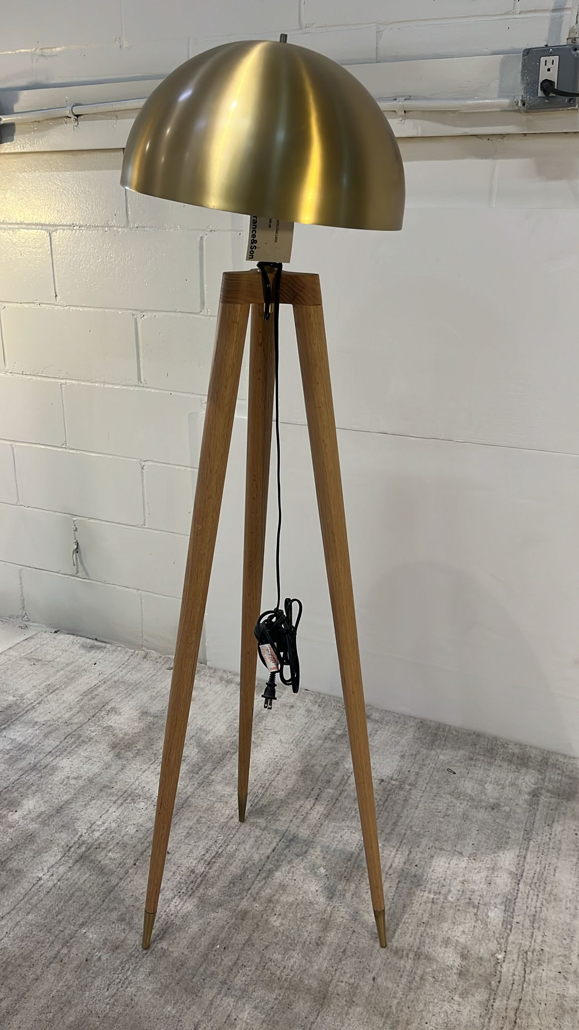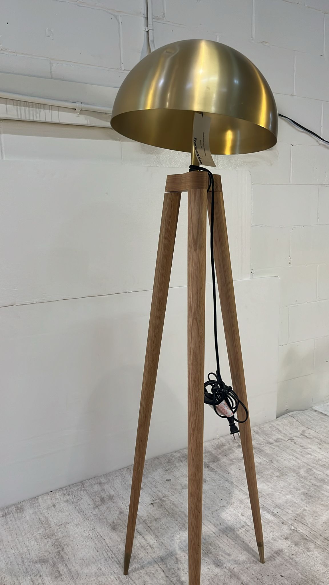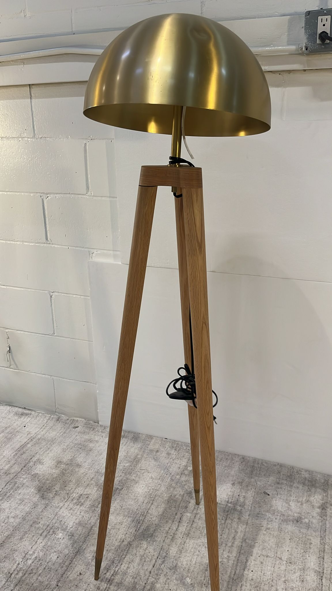 This unique floor lamp will add a touch of retro charm to any room. The wood tripod base provides sturdy support for the brass dome shade. Inside the domed shade two 40 watt candelabra bulbs reflect light downward to provide ample focused lighting.