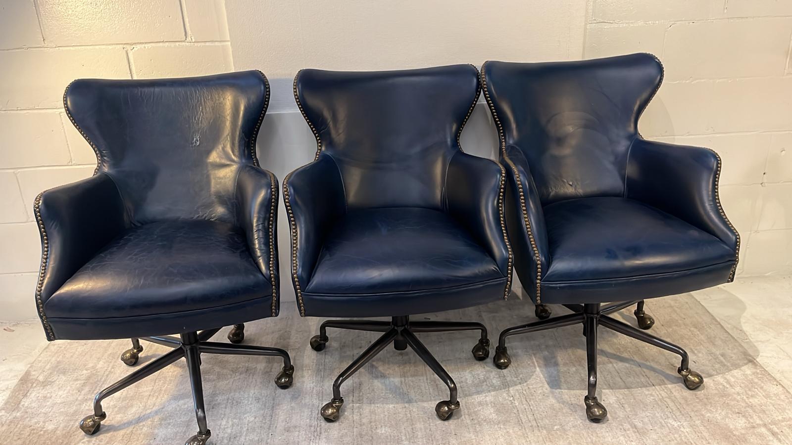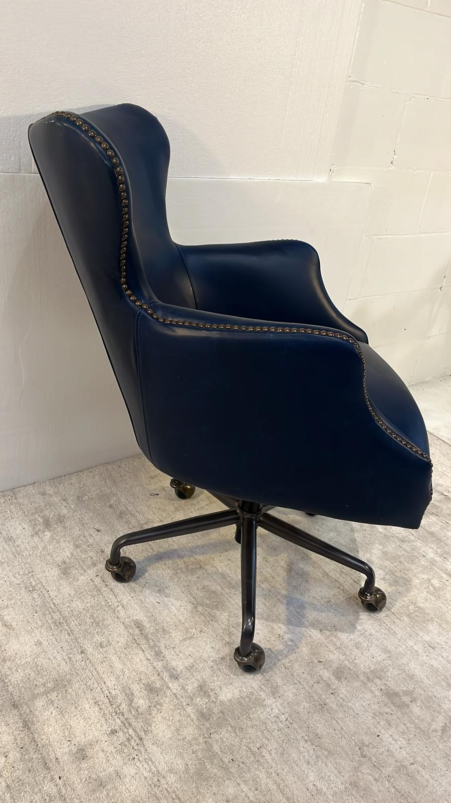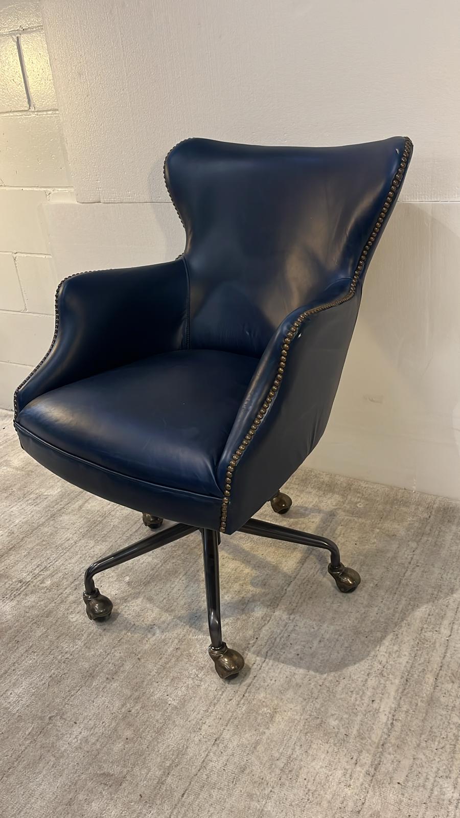 This functional chair has a lever for releasing the back of the chair back. Sits on a 5 ball caster swivel base. Covered in Top Grain Vintage Cigar leather.