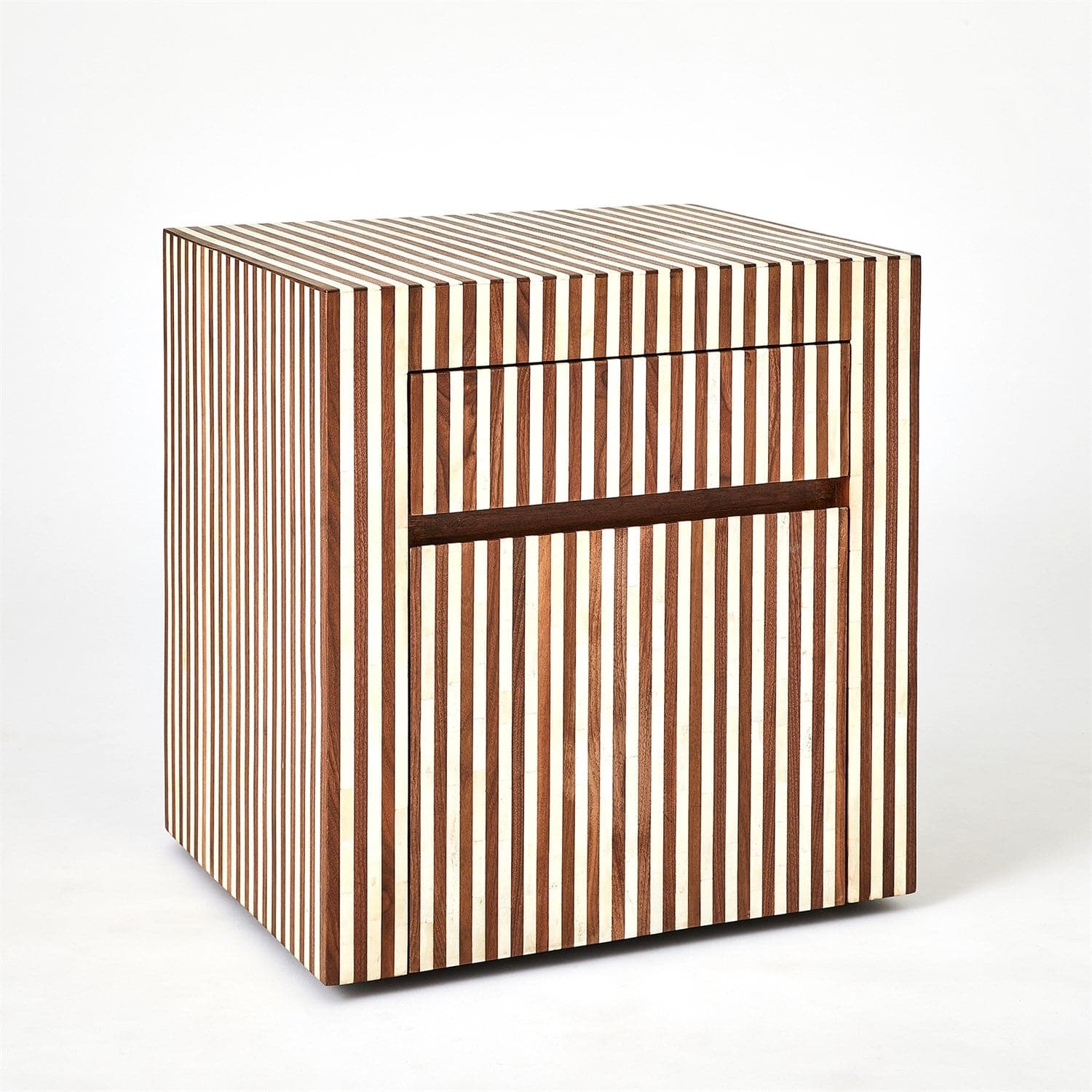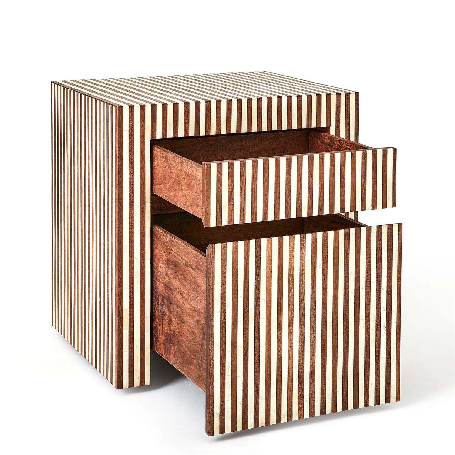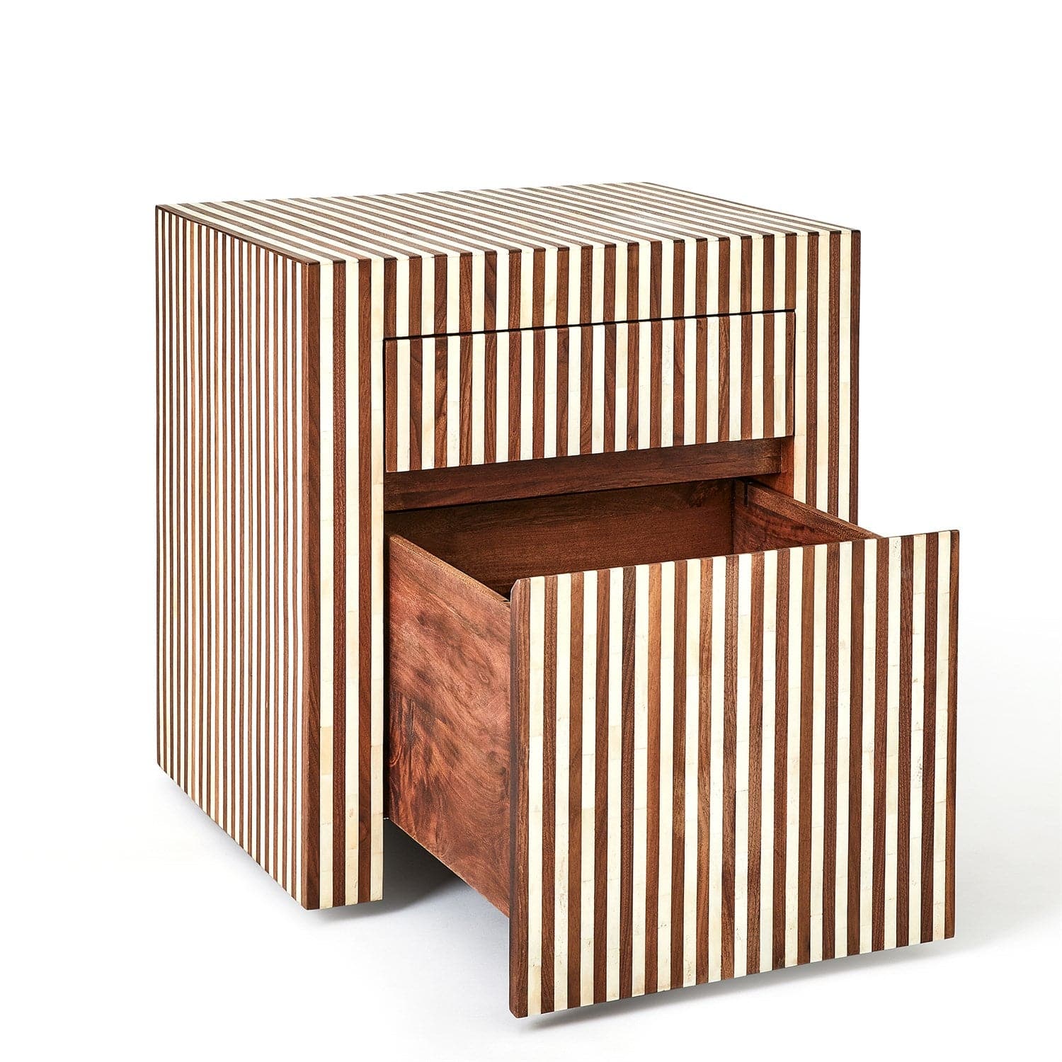 The Sienna Collection pattern is made by alternating walnut wood, bone, and mango wood. Natural lacquer finish.