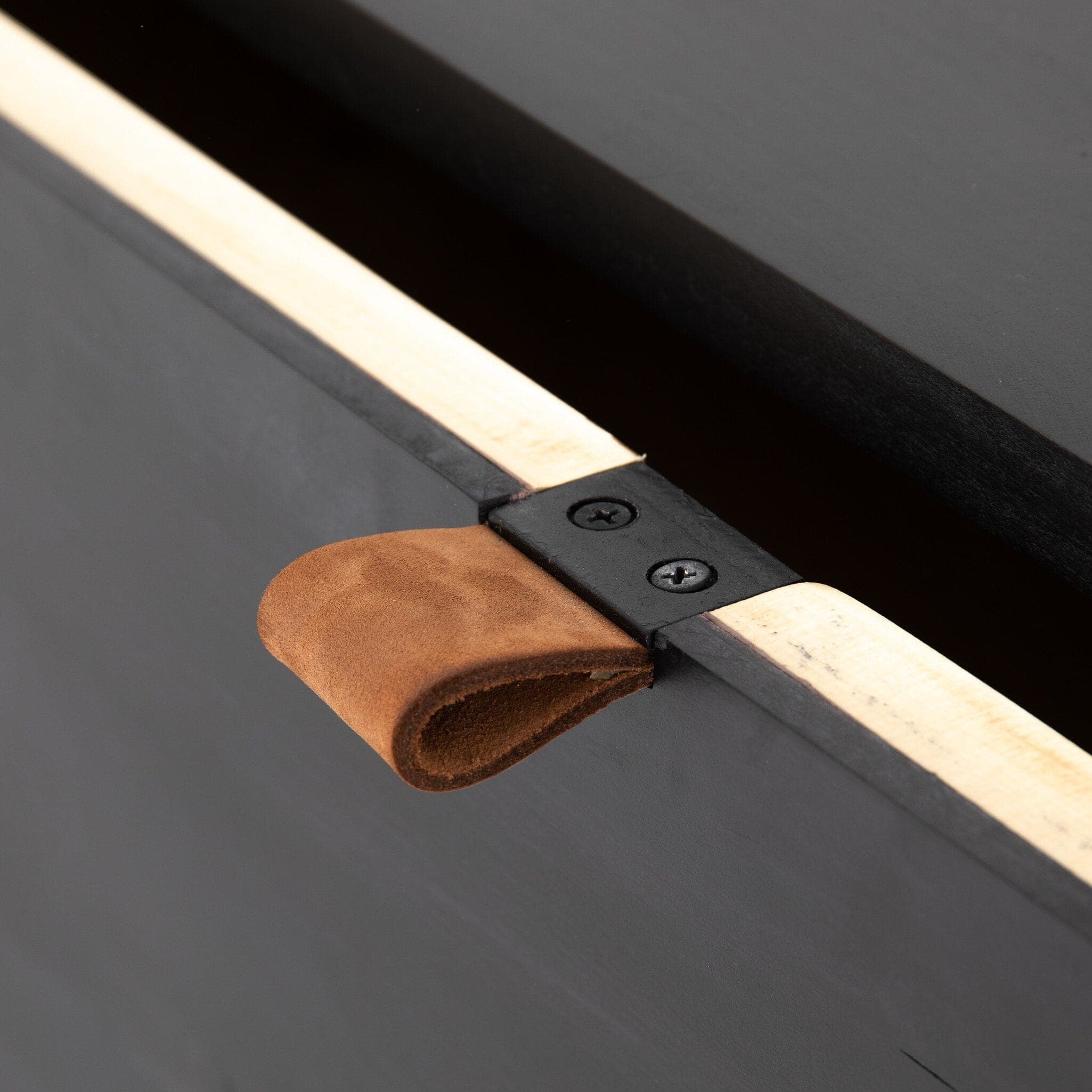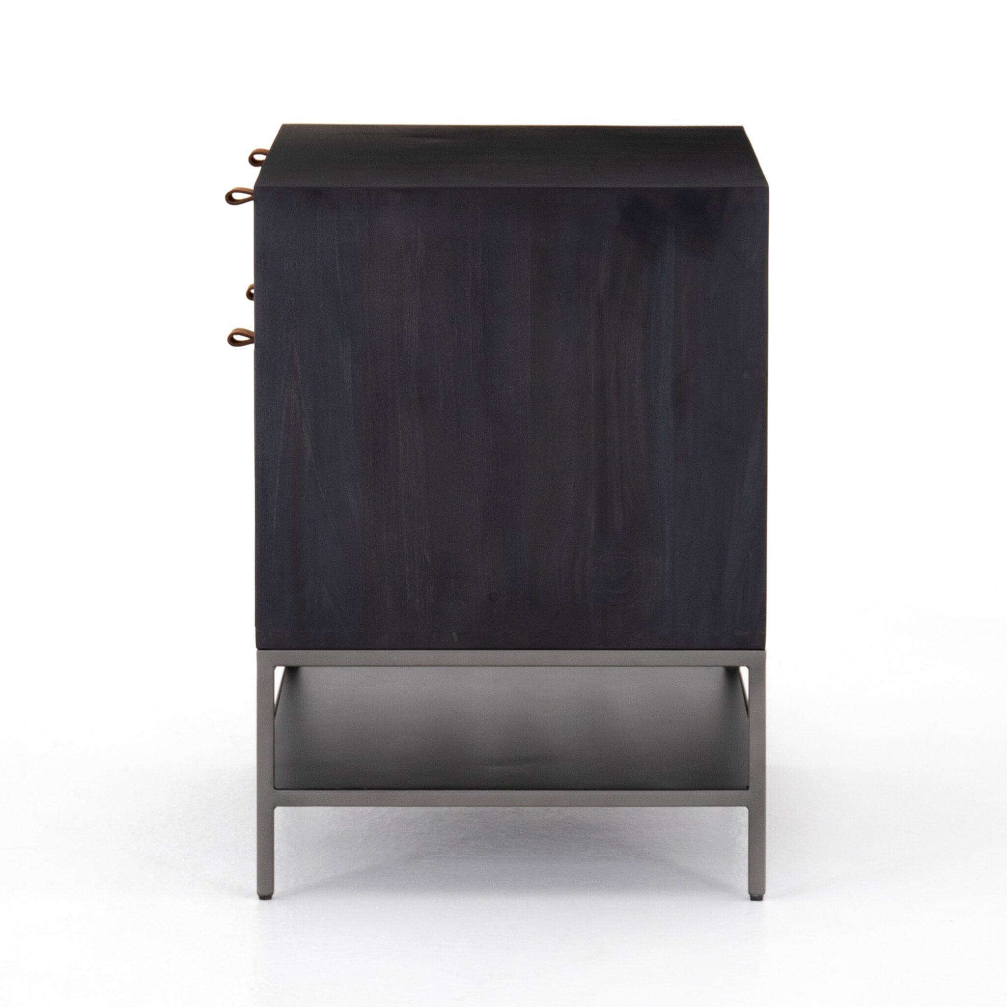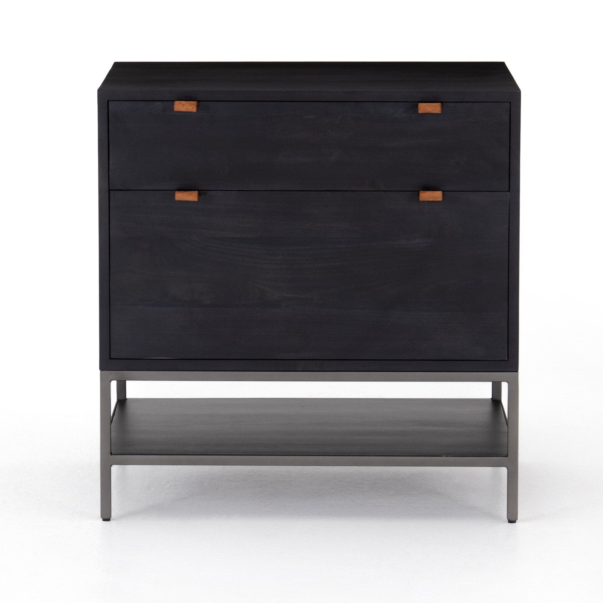 - Description: Inspired by clean mid-century design, black-finished poplar offers generous extra file storage space, with a fully finished back plus metal-secured leather pulls for an element of surprise. Great solo or paired with matching desk or credenza.