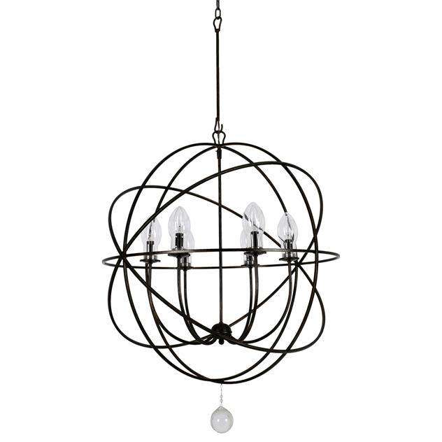 Renew your outdoor living space with this stunning Solaris Chandelier now rated for outdoor applications. This fashionable design features a series of flowing sphere shapes surrounding a cluster of candlestick bulbs covered by clear glass shades all suspended by a distinctive chain-and-hook detail. The creative mix combines a contemporary wrought iron form with a traditional, English bronze finish. The clean-lined Solaris model looks good in any setting — from traditional to contemporary and can be used both indoors and outdoors.
