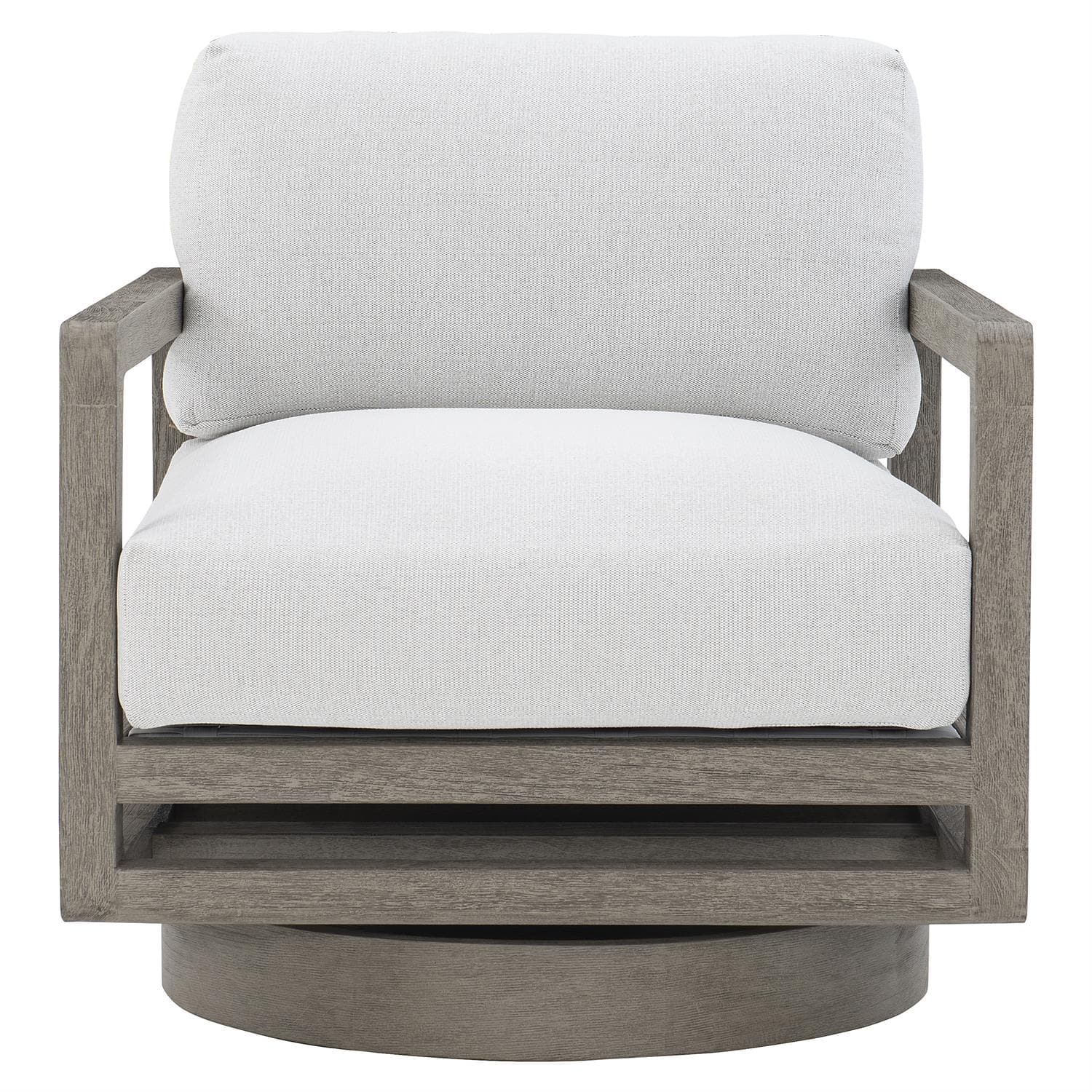 A vision of modern sophistication, this outdoor swivel chair pairs a weathered teak frame with plush performance cushions. Simply designed and finely crafted, the Tanah swivel chair combines clean lines and geometric angles for a distinctly modern look. The open frame is crafted from weathered teak, a naturally durable and water-resistant material that grows more beautiful with age. Dressed in performance fabric, a sumptuous cushion and fiber back pillow provide unrivaled comfort. A thick, round swivel base draws attention to the mobility offered by this sophisticated chair.