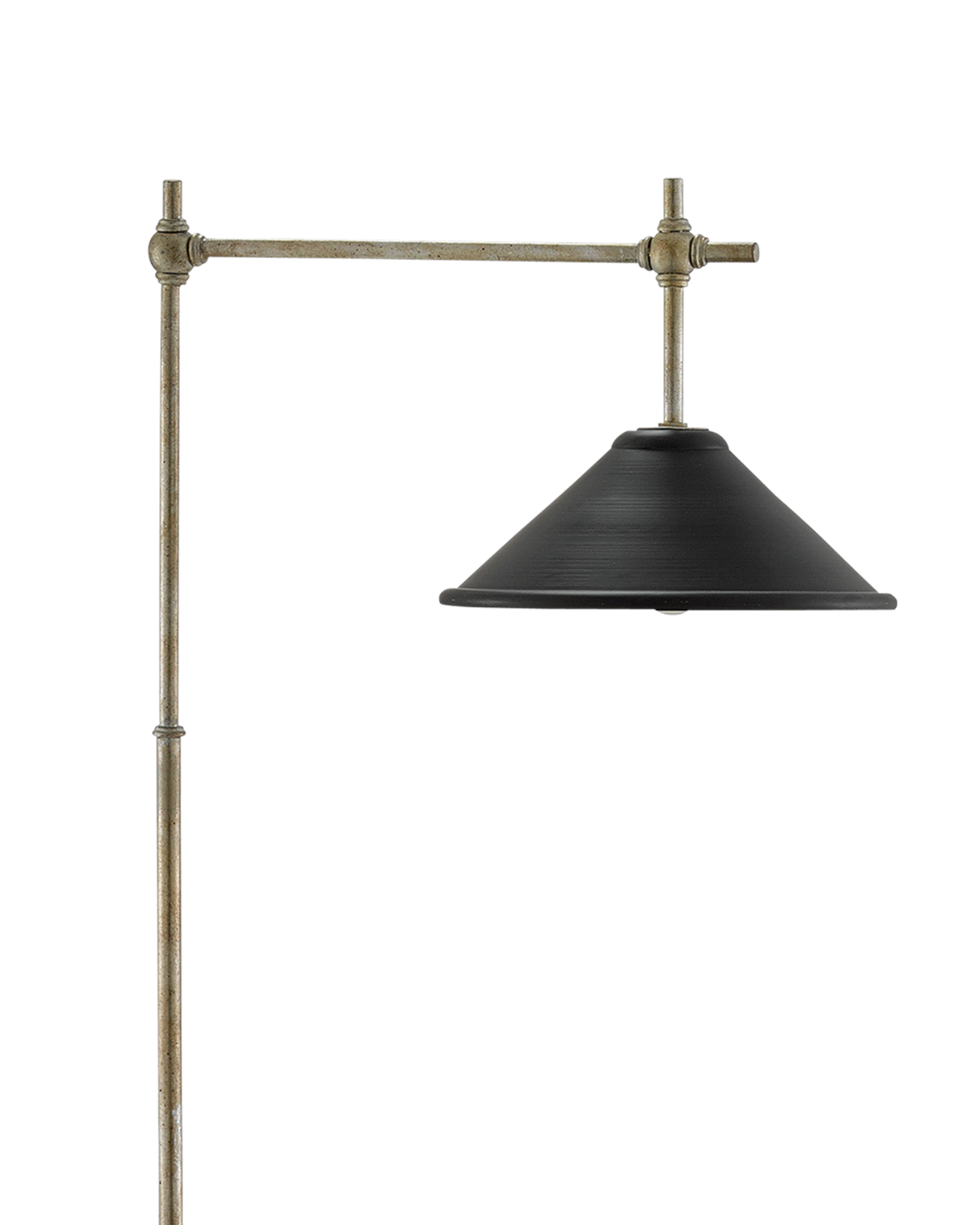 Description: Architectonic with a slight Asian vibe, the Dao Floor Lamp features a weighted base and a slim column joined by knobby globes in a silver Granello finish. The exterior of the tapered shade on this silver floor lamp is finished in satin black, while the interior is in silver.
