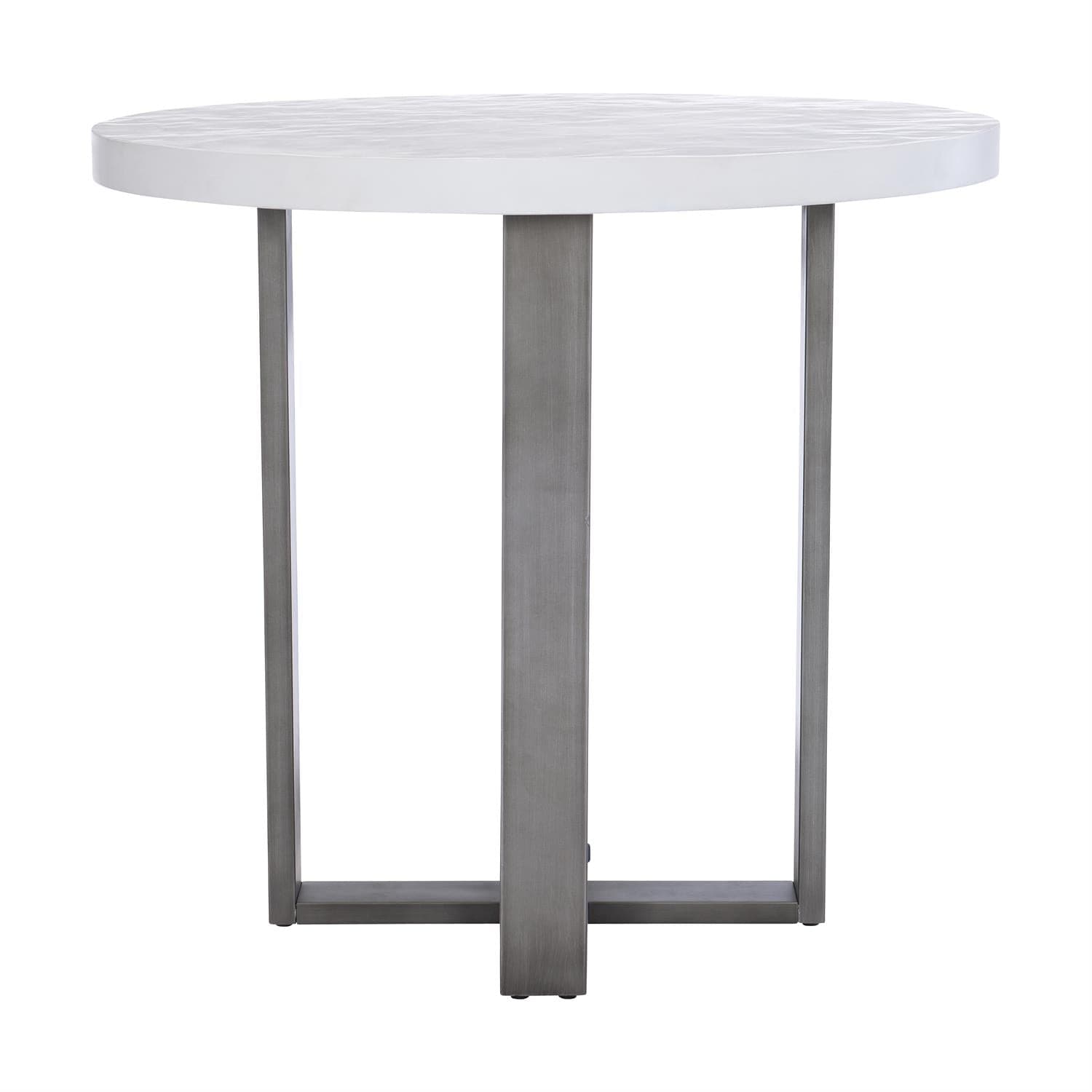 The Del Mar counter table is crafted from a round glass-reinforced cast concrete top sitting on an elegant stainless steel turnstile base. The deep Flint Gray finish balances the brighter tone of the top's Bone finish. The table sits at a counter height of 36 inches.