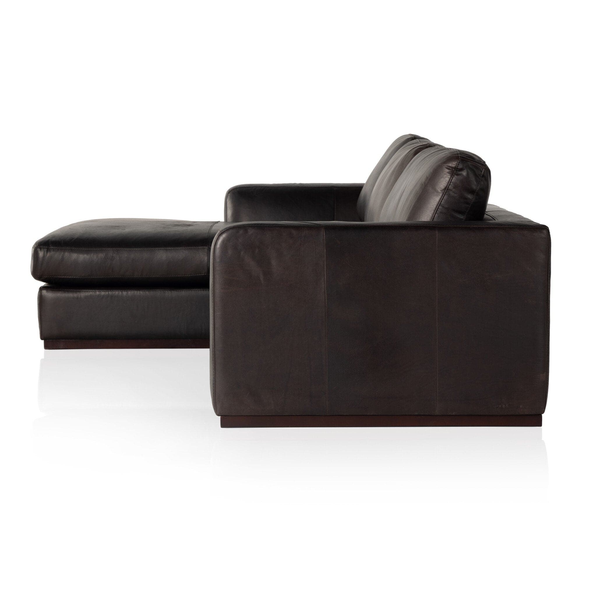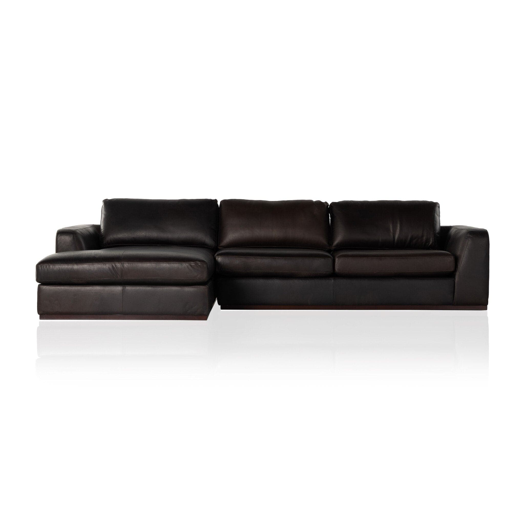 • Description: Simply styled for everyday lounging. Rich top grain leather makes for a polished presentation, with subtly flared sides for shapely effect, all grounded by a wrapped plinth base. Left arm-facing chaise to matching modular sectional.