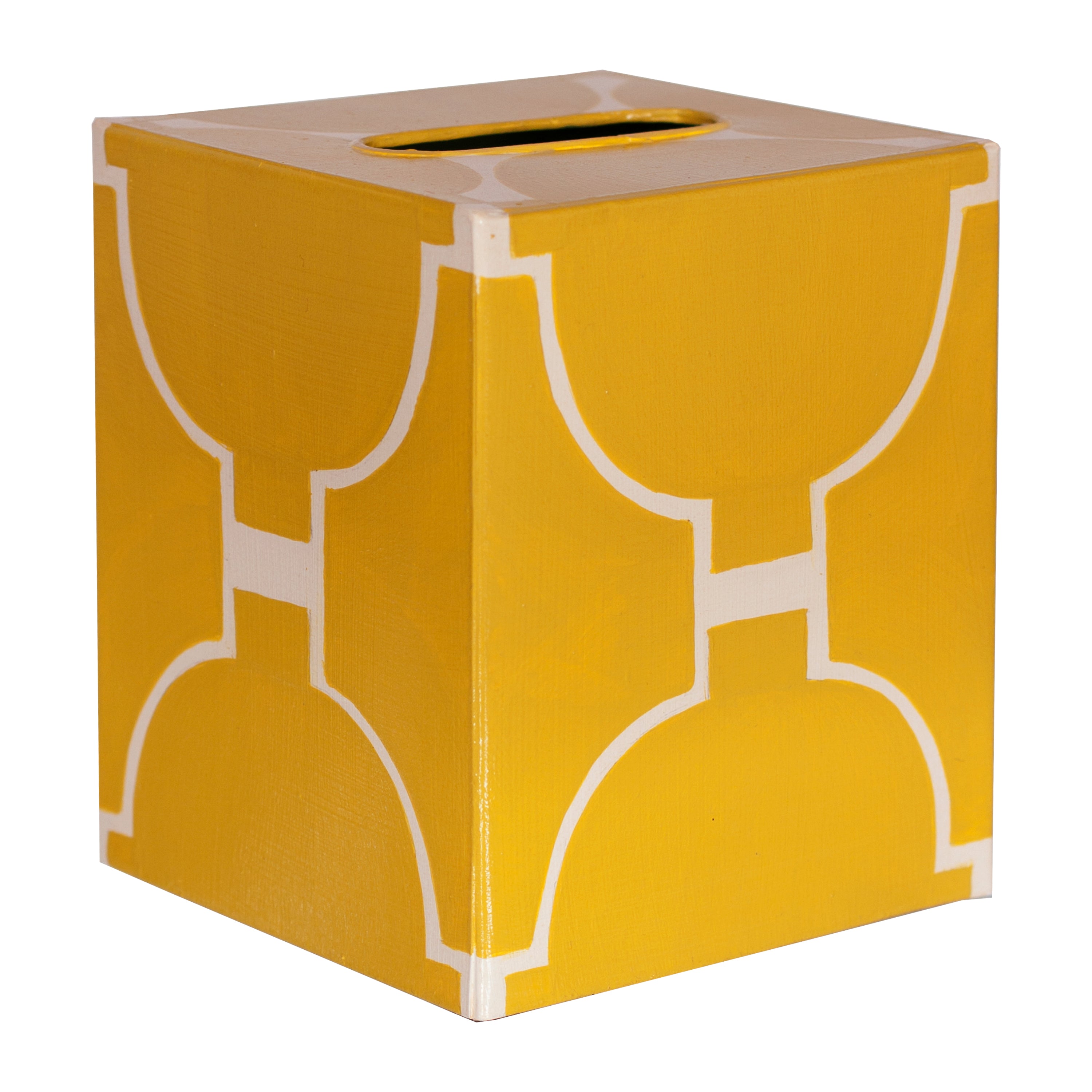 Description: Quickly and easily complete the look of any room with polished details that elevate your vision from wow to POW! Our elegant tissue box covers come in a wide range of textures and patterns, including this sunny yellow and cream geometric design.