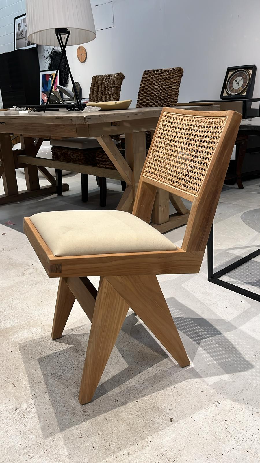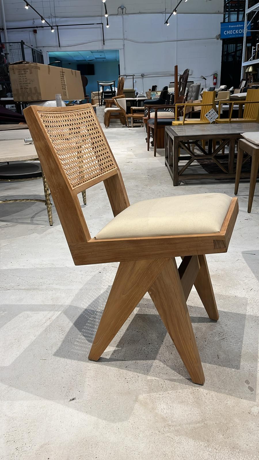 Our Jeanneret Armchair is inspired by Swiss architect Pierre Jeanneret's mid-century modern 1950s Chandigarh design. Like the original, our contemporary reproduction has V-shaped solid wood legs, and a cane seat that provides plenty of comfort. This tweak to the design is made with solid Teak wood and a built-on fabric seat.