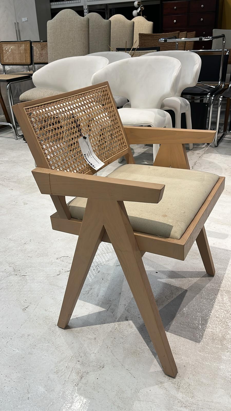 Add a touch of mid-century modern style to your home with our Jeanneret Armchair. Inspired by Swiss architect Pierre Jeanneret's 1950s Chandigarh design, this contemporary reproduction features V-shaped solid wood legs and a cane seat for plenty of comfort. Measuring 32 inches in height, 22 inches in width, and 20 inches in depth, with a seat height of 18.5 inches and an arm height of 24.5 inches, this chair is spacious and comfortable. Made from solid teak wood with a built-on fabric seat, this chair is both durable and stylish. Choose from a white washed teak or natural teak finish, and pair it with our Jeanneret Dining Table to complete the set. Best of all, this chair comes fully assembled, so you can start enjoying it right away.