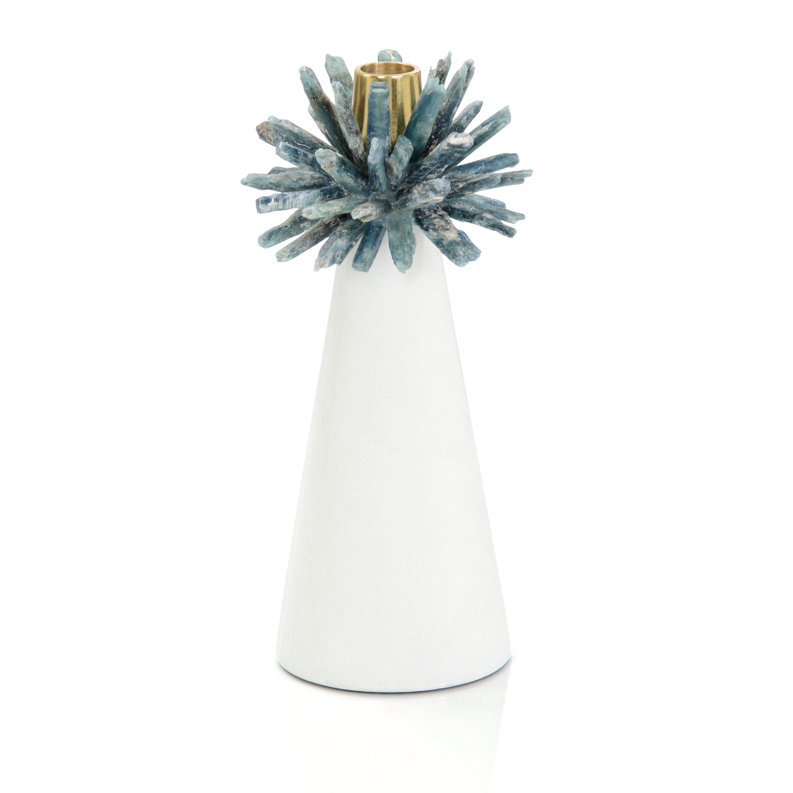 Description: A gorgeous formation of natural cyanite crystals form a starburst pattern that is gently perched atop a tapered white body of smoothed marble. The tip of the piece is adorned in Polished Brass, creating a lovely juxtaposition between shiny metallics and rugged stone. Possessing a wealth of dynamic texture, the Cyanite Starburst Candleholder is a wonderful accent piece to elevate the look and feel of an interior space. A gorgeous addition to any décor, the piece can also be placed alongside its alternate variant to further enhance the look.
