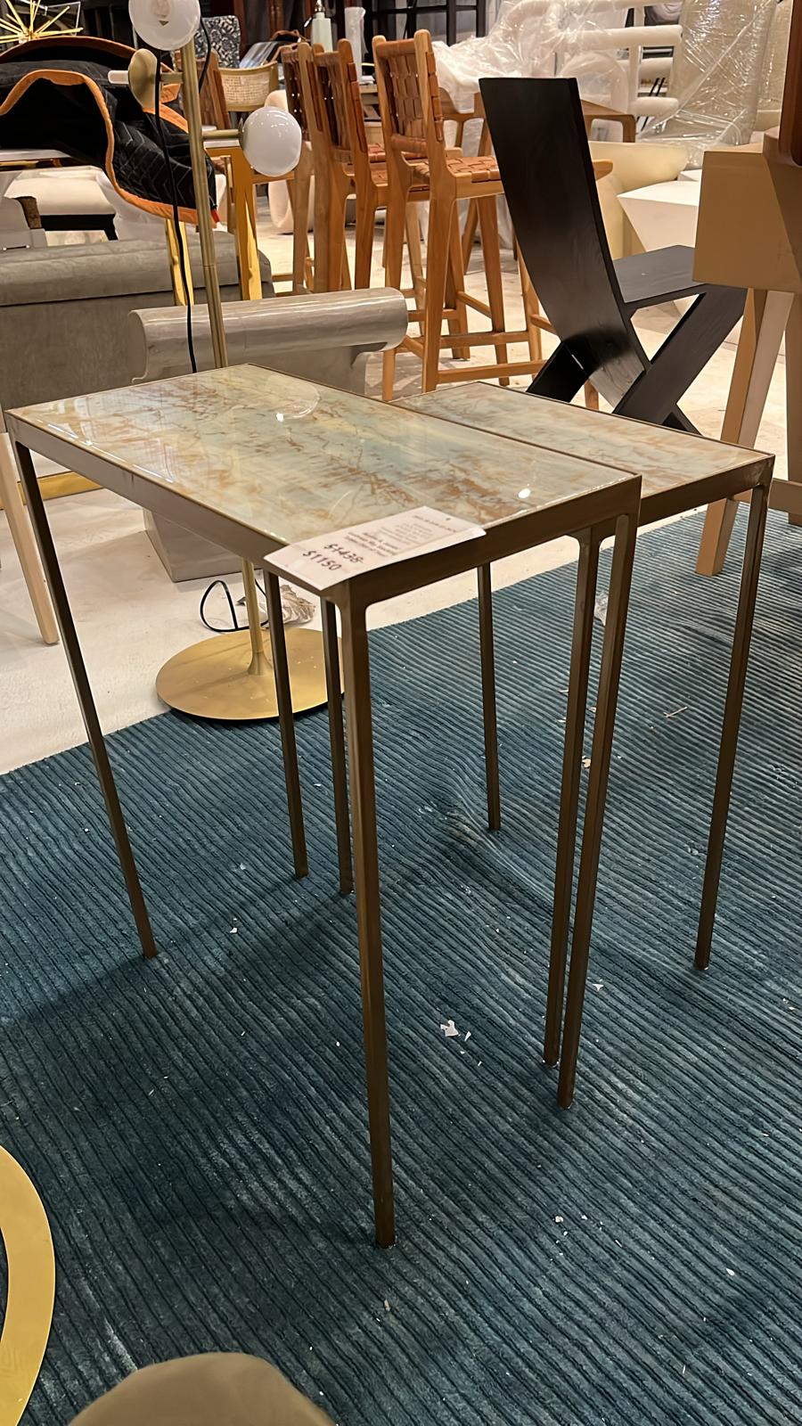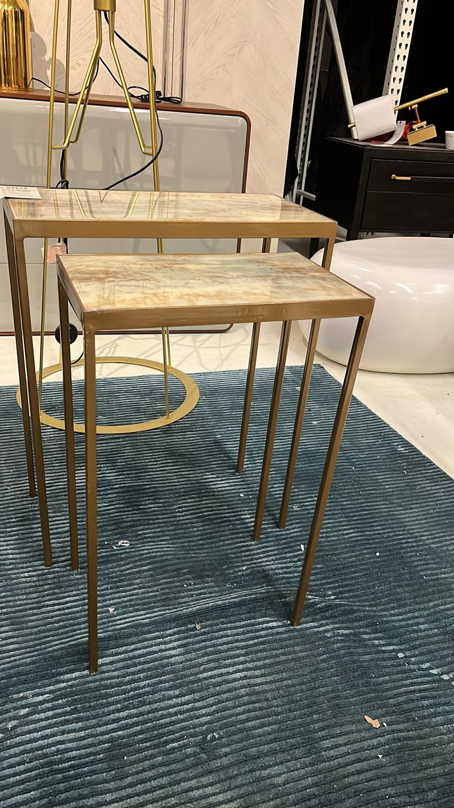 Introducing the Austin A. James' Lustrous Sky Stacking Tables (Set of Two) by John Richard - a versatile and elegant set of tables that will add a touch of sophistication to any room. With dimensions of 23"H X 15" W X 9"D, and 25"H X 20" W X 10" D, these tables are the perfect size to complement any space. The tables are made of metal and porcelain, featuring a hand-applied vitreous finish on the tops, Lustrous Sky by Austin A. James. The bases and legs are done in hand-finished gold, adding a touch of luxury and elegance.