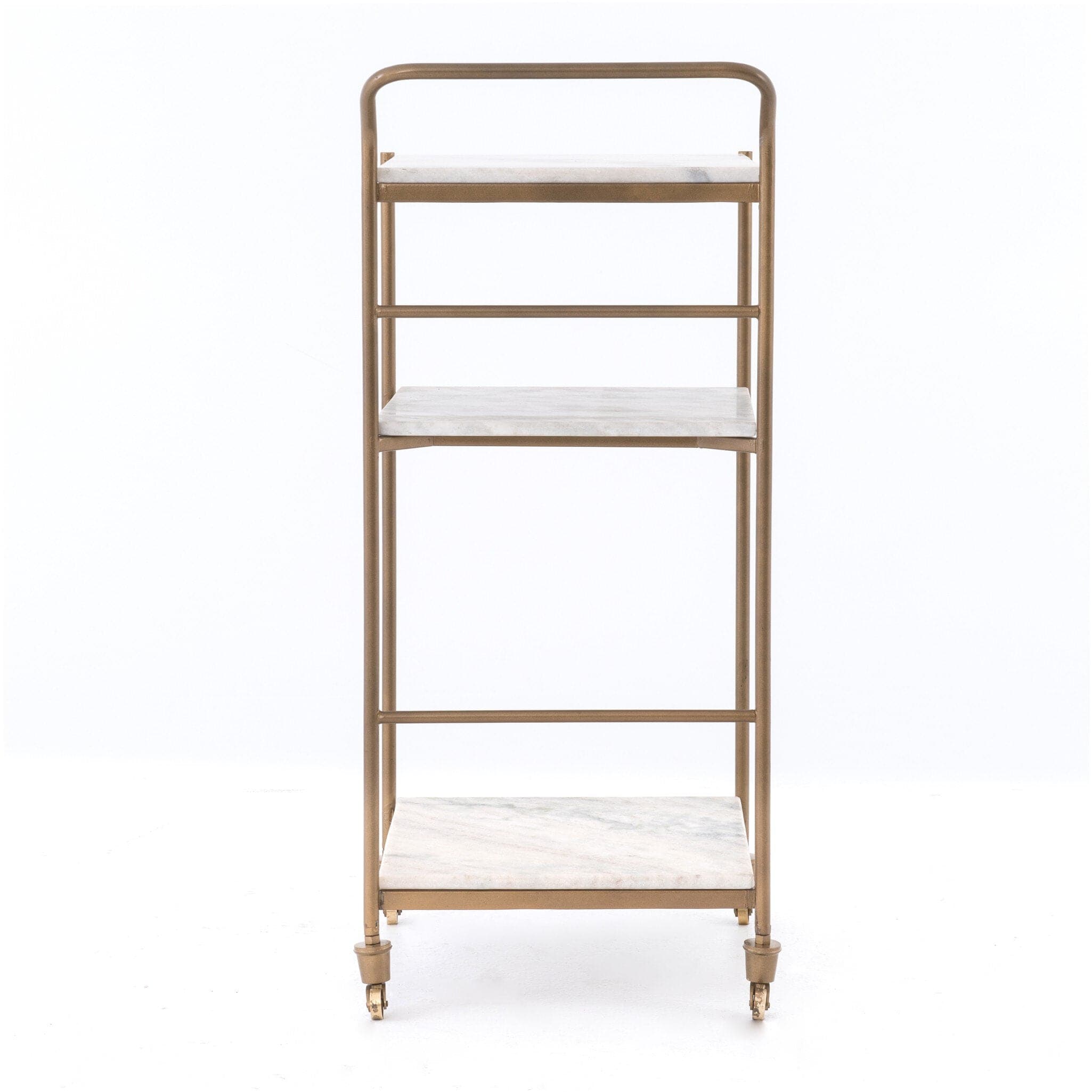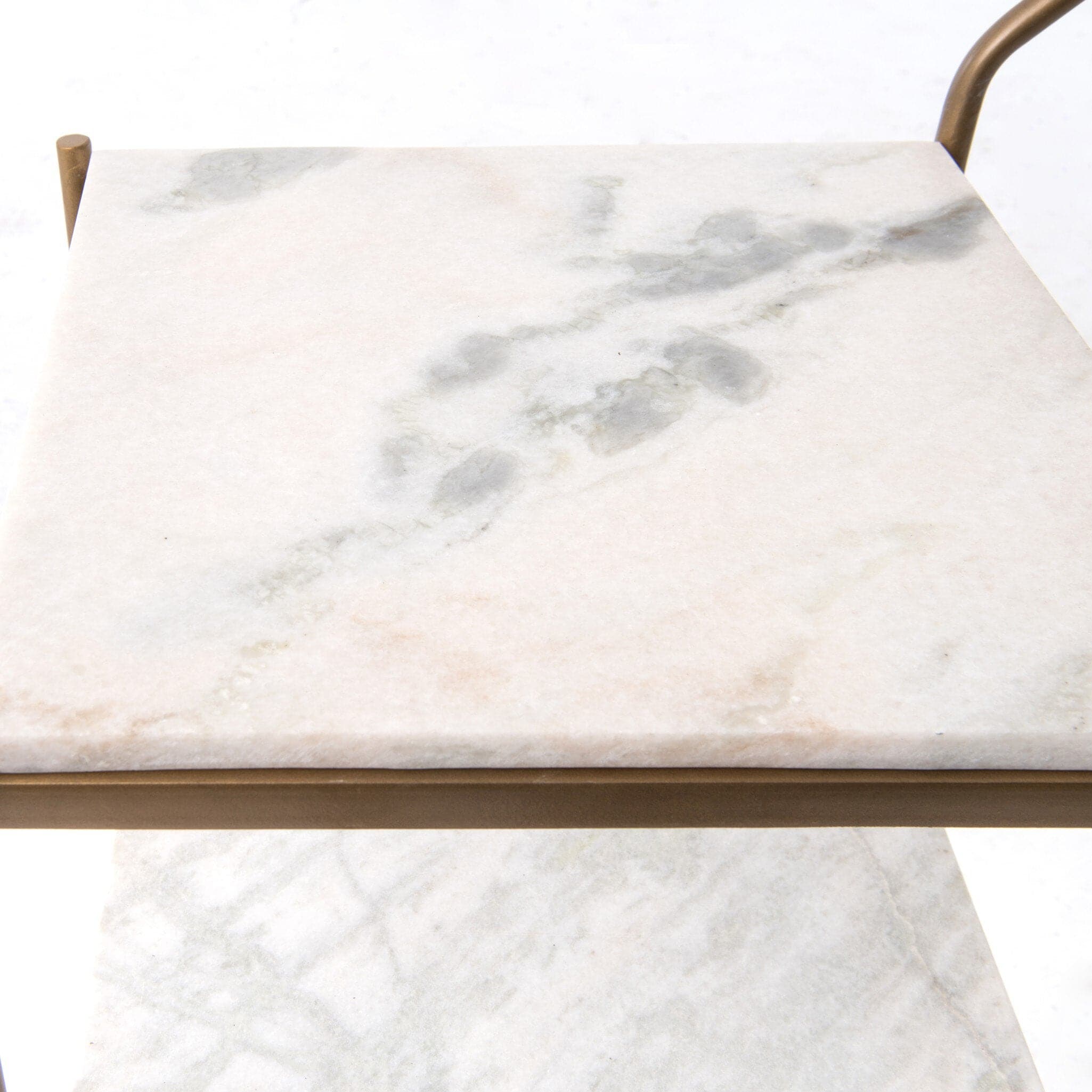 - Description: Add a pop of sophistication to any space. Classic white marble lays three tiers of smooth shelving for plenty of space. Antique brass frame and casters place a feminine spin on bar styling.