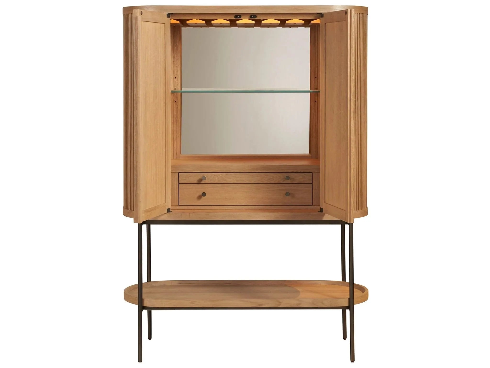 The Linnea Bar Cabinet offers a fresh interpretation of classic design, with two doors unveiling ample space for spirits and glassware. Clad in Natural Oak and complemented by aged Satin Pewter metal accents, this piece embodies modern elegance. The subtle ridging in the wood enriches its character, blending functionality with a distinct aesthetic appeal.