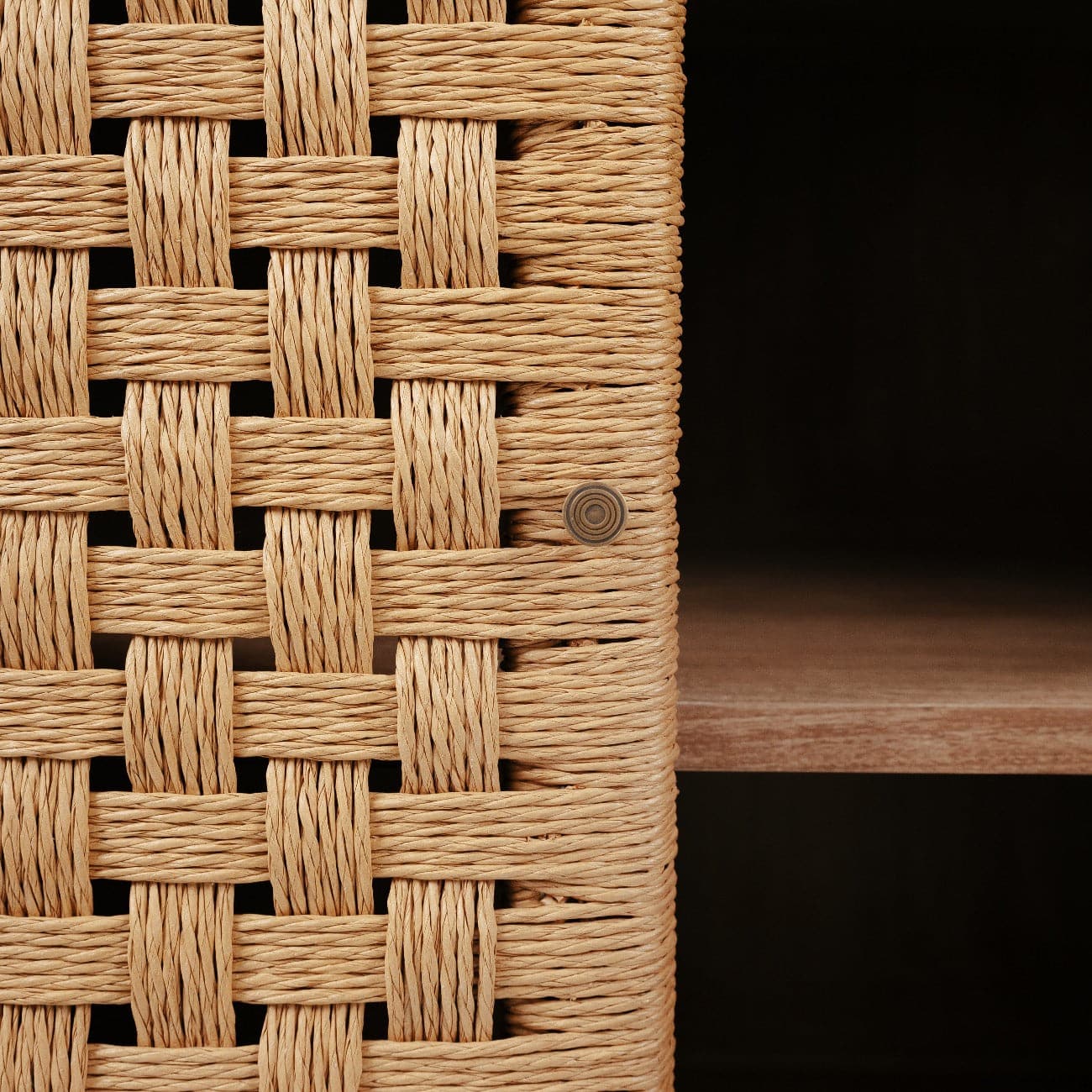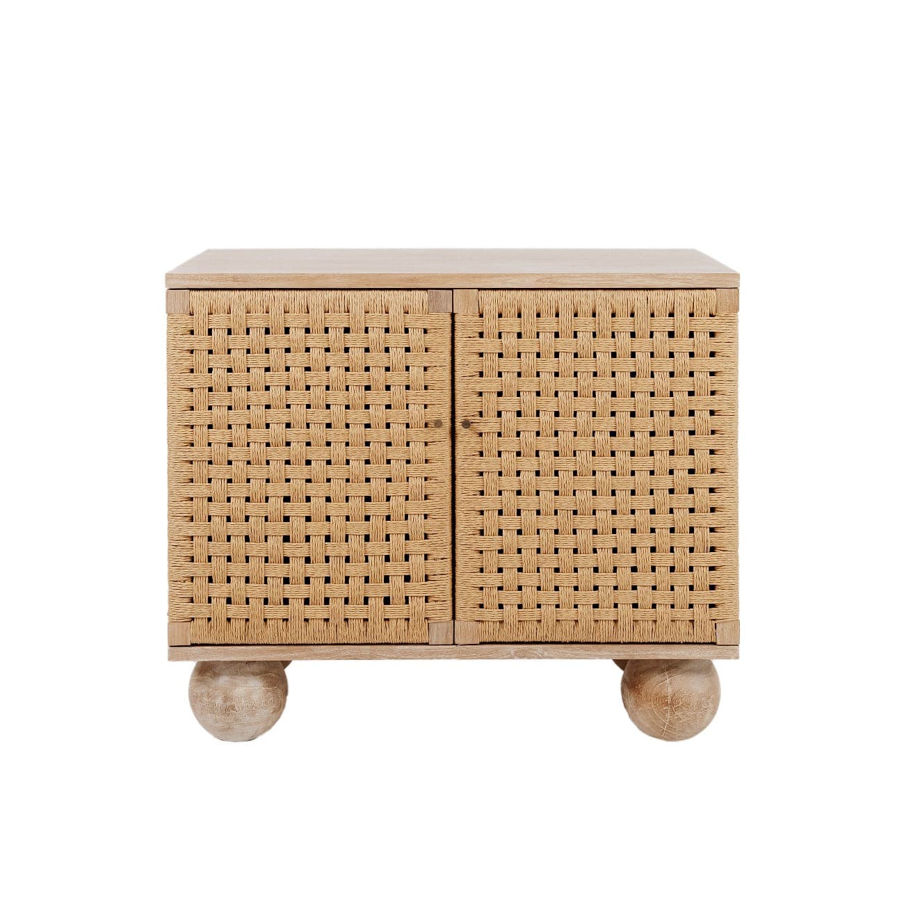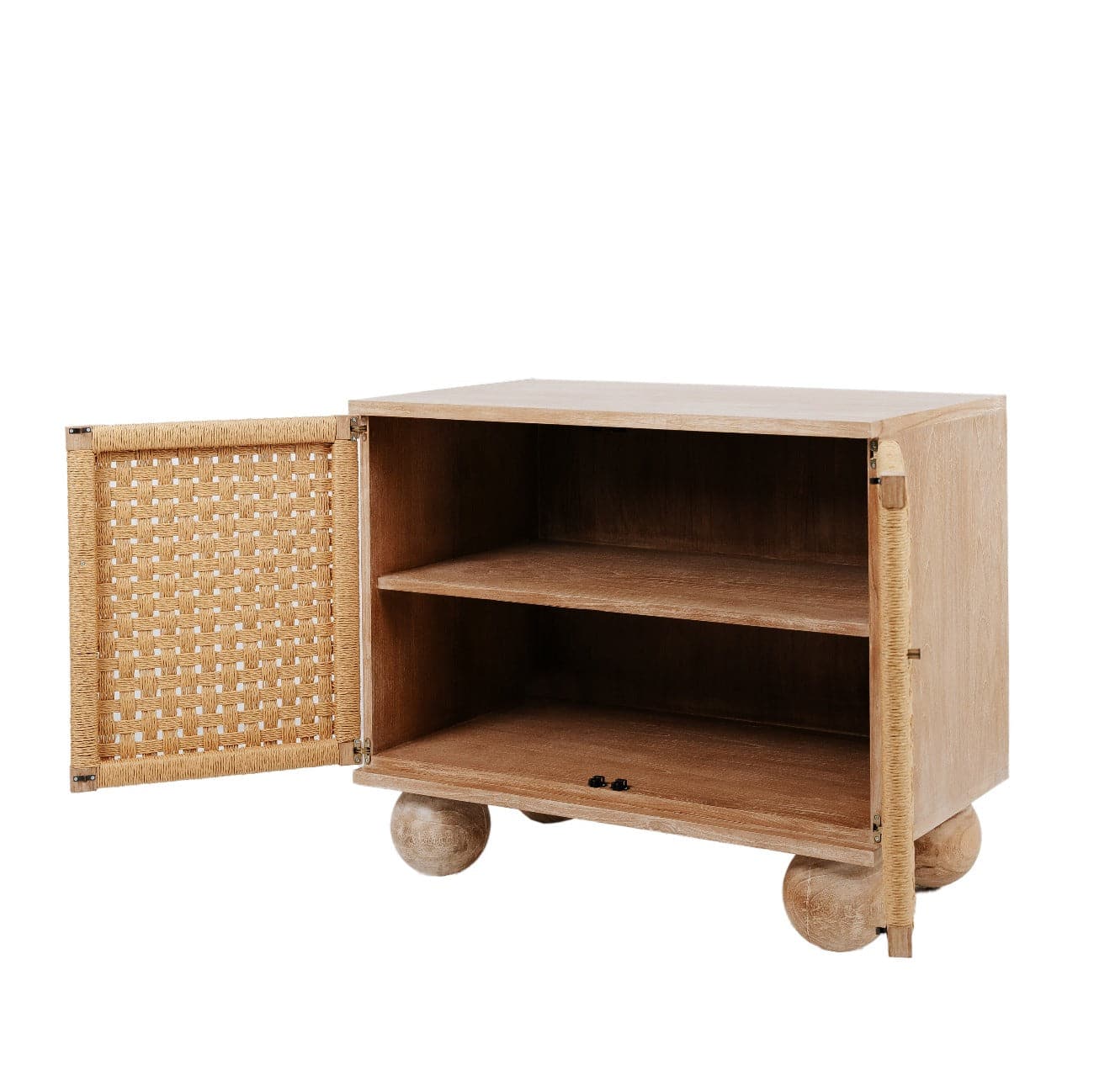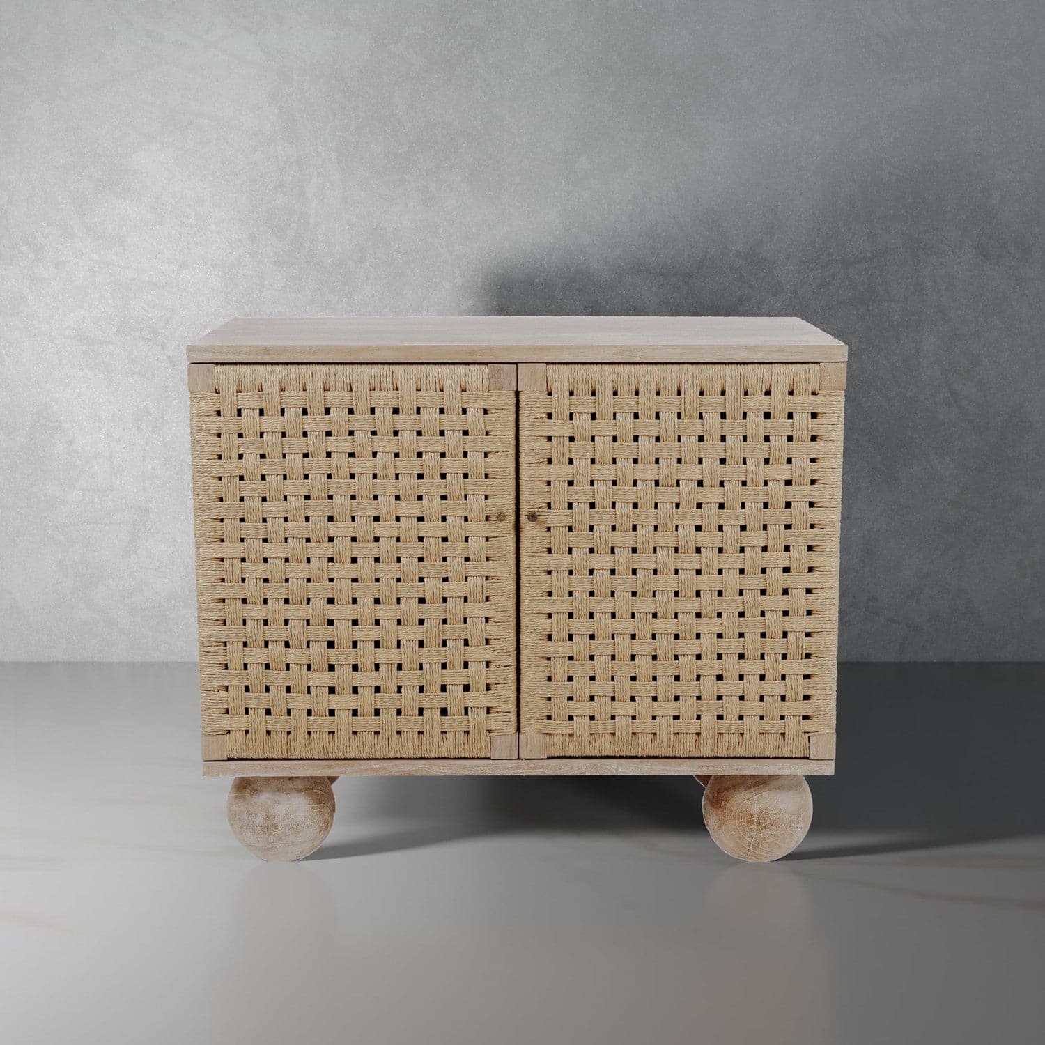 Expertly crafted from teak wood this charming cabinet features bun feet and rattan doors. This piece is the perfect storage solution for both modern and contemporary style spaces.