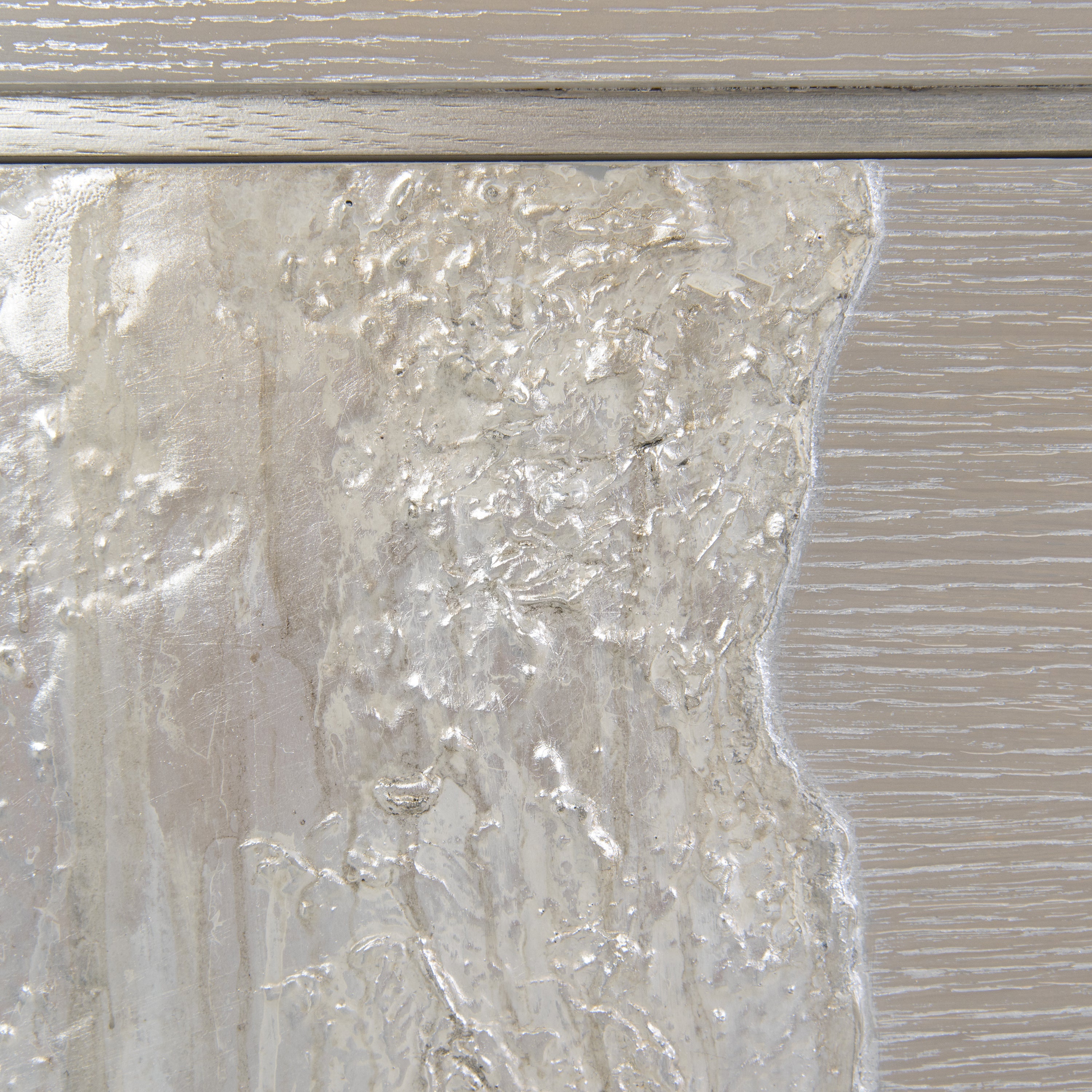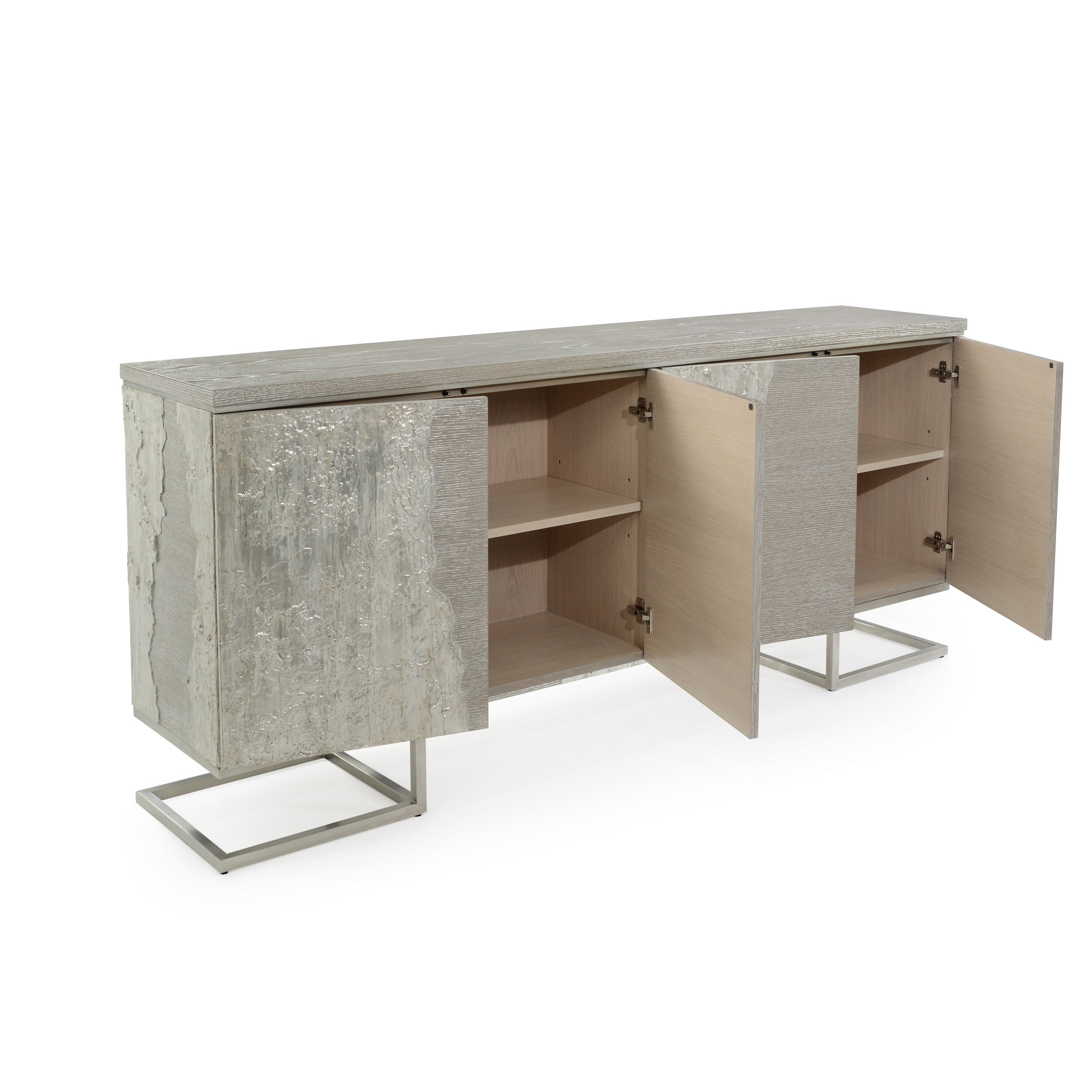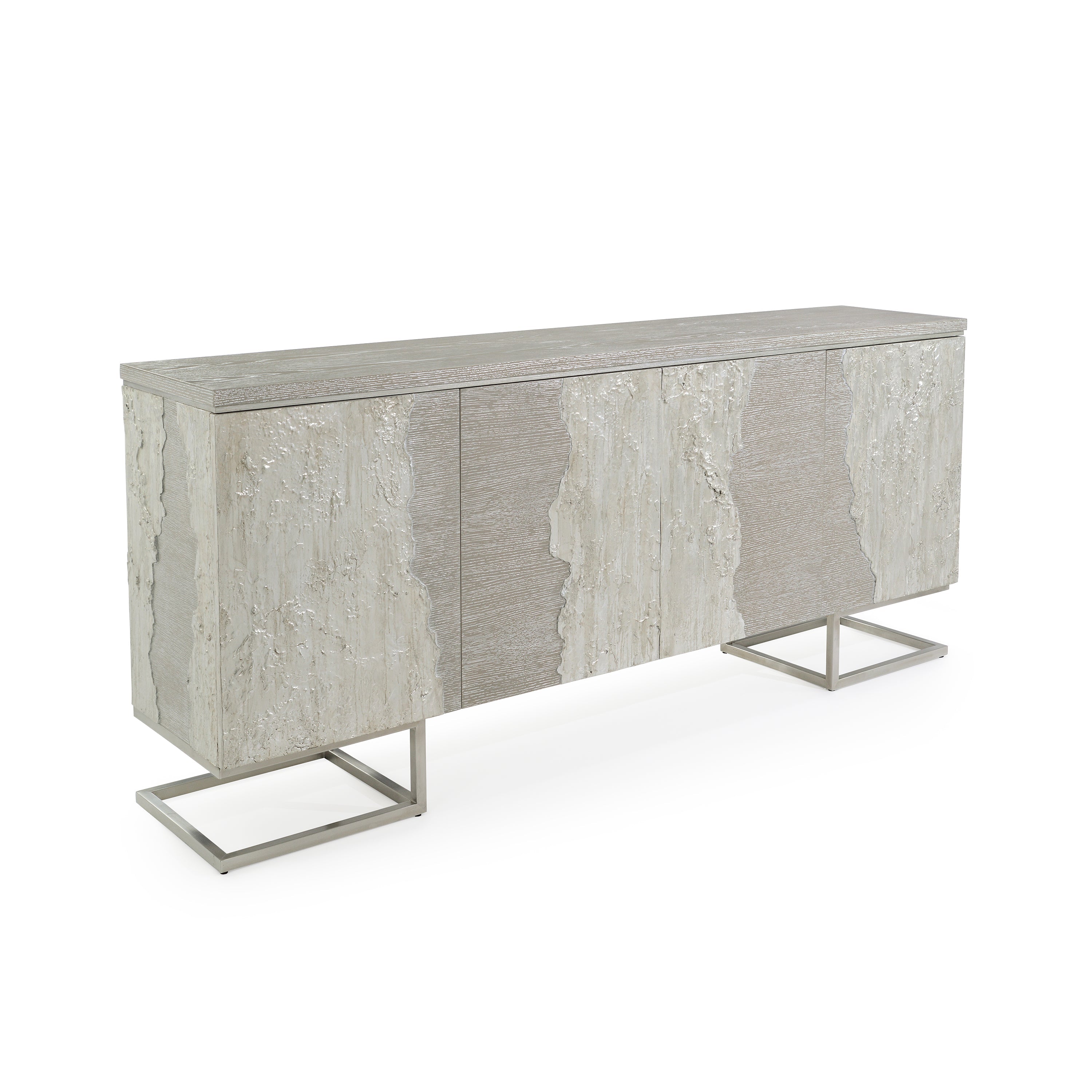 Description: The Fusione Four-Door Cabinet expresses a delightful duality, providing a wealth of rich textures to enhance any interior space. Made from natural oak wood, a rich Silver Grey Driftwood finish collides head-on with the stunning textures of Washed Silver resulting in gorgeous interplay between coarse and smooth surfaces. With hardware accents in Pewter Silver, this cabinet possesses a distinctive sense of elegance that demands attention.