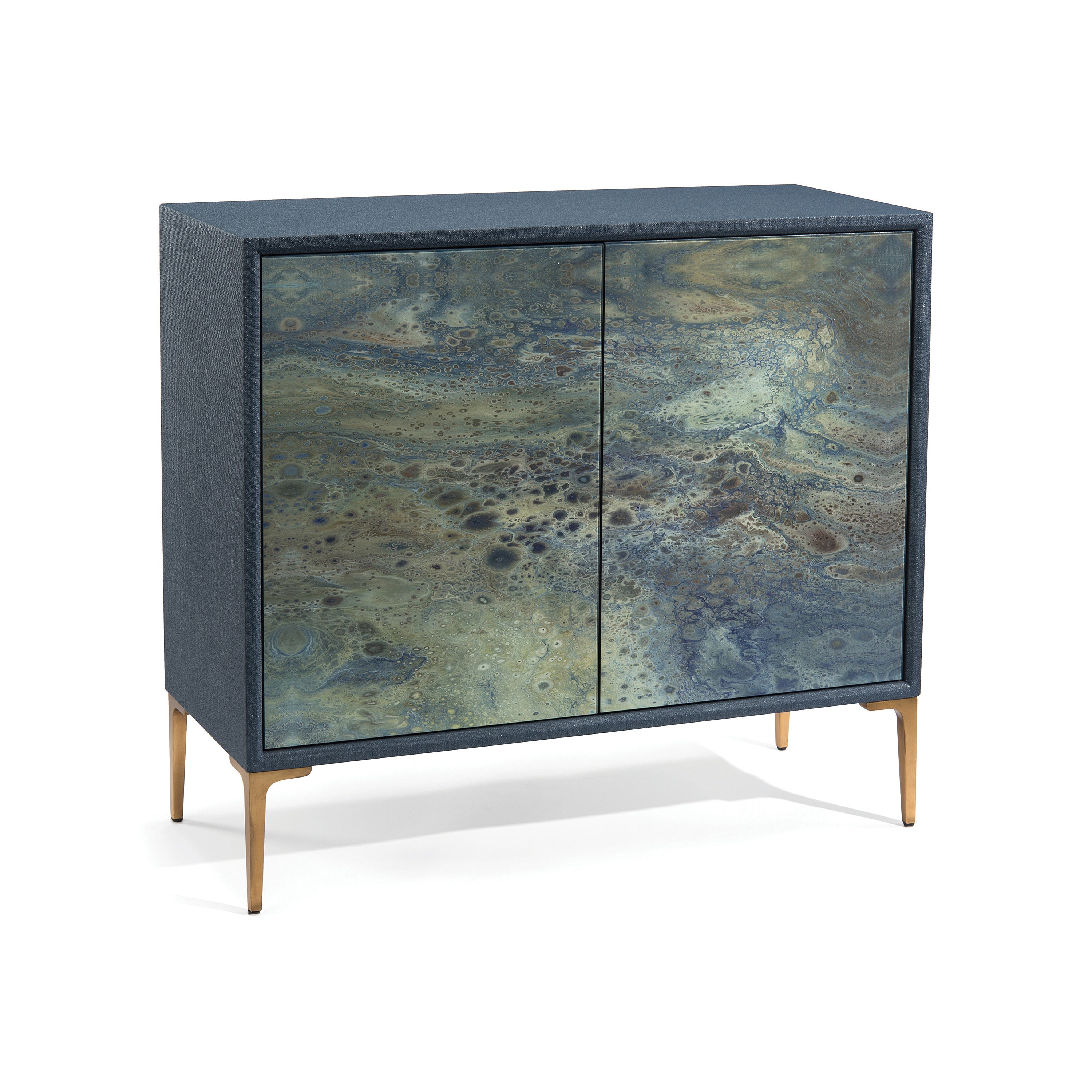 Description: This linen-inlaid, two-door cabinet is finished in indigo batik. An original work, Pavo, is reverse-printed on glass across the two doors. The case stands on four gilt metal legs