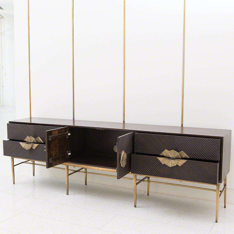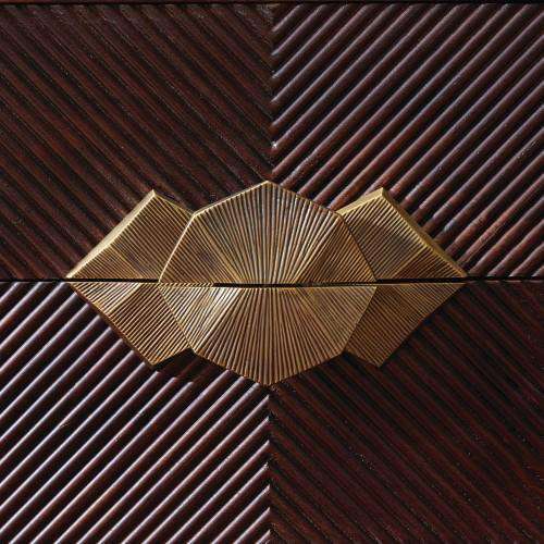 Carved dark wood set off the contrasting brass hardware inspired by the turtlebacks of the oversized species in the Galapagos island.