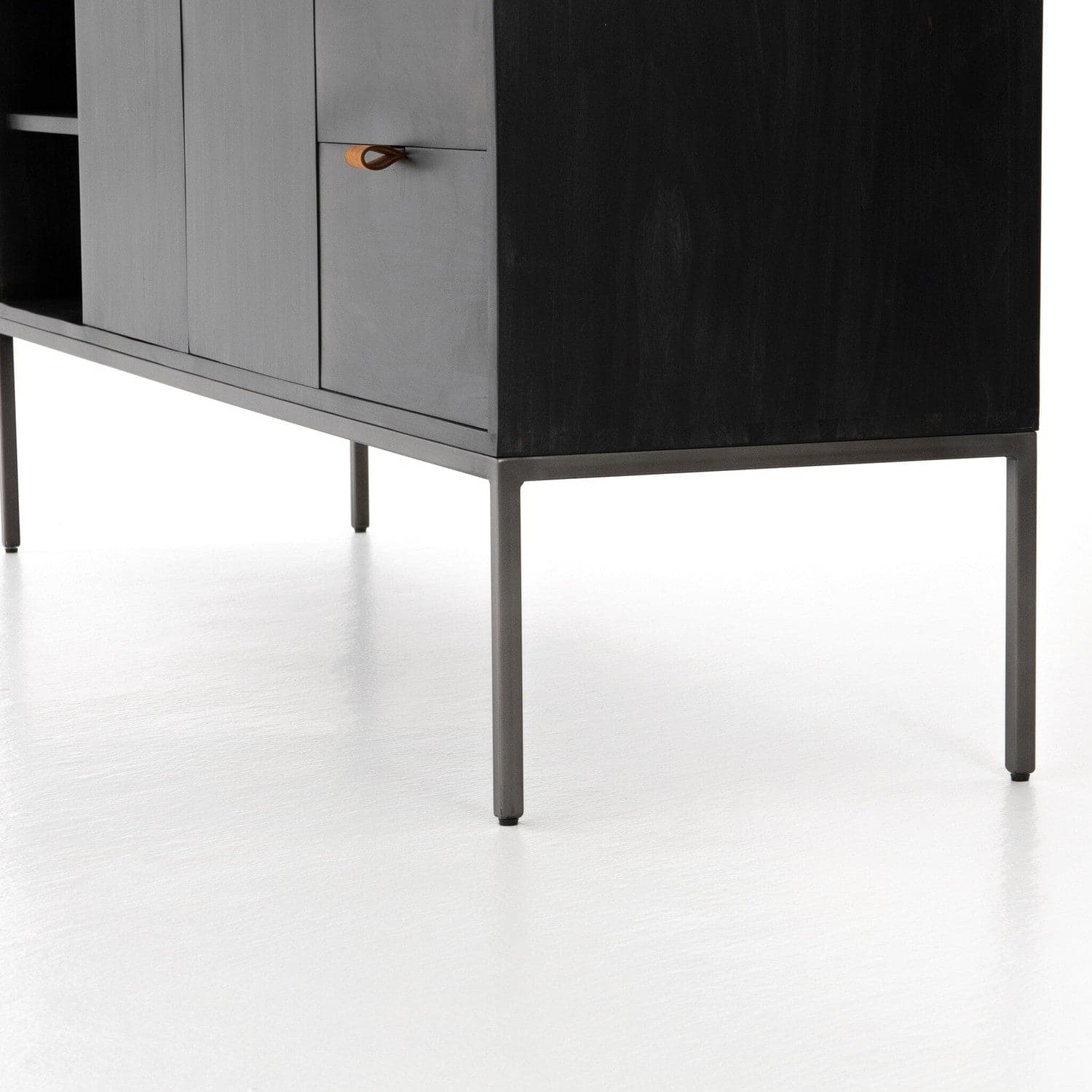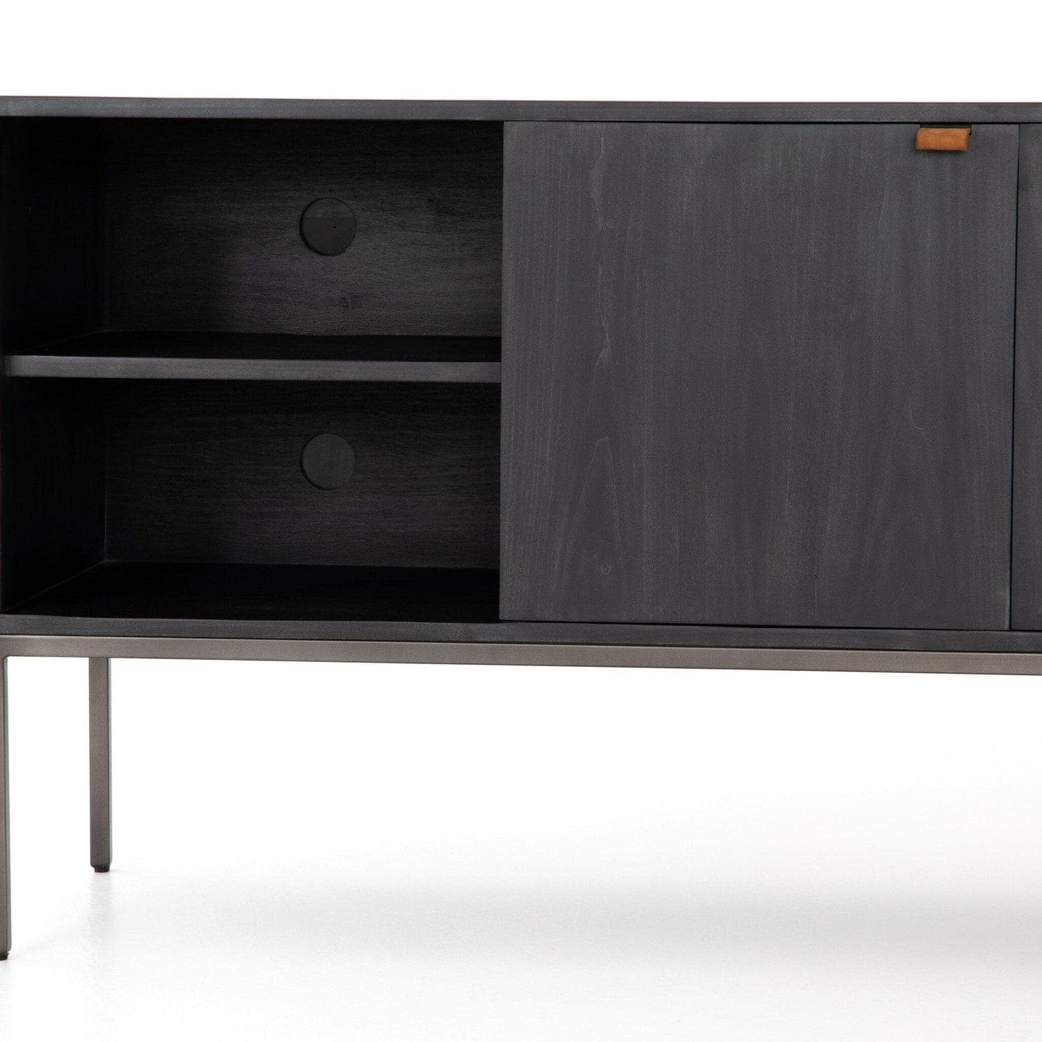- Description: Inspired by sleek mid-century design, a stylish console of black-washed poplar offers ample media storage space by way of open shelving, center cabinetry and spacious dual drawers. Metal-secured pulls of toffee top-grain leather add a textural element of surprise.