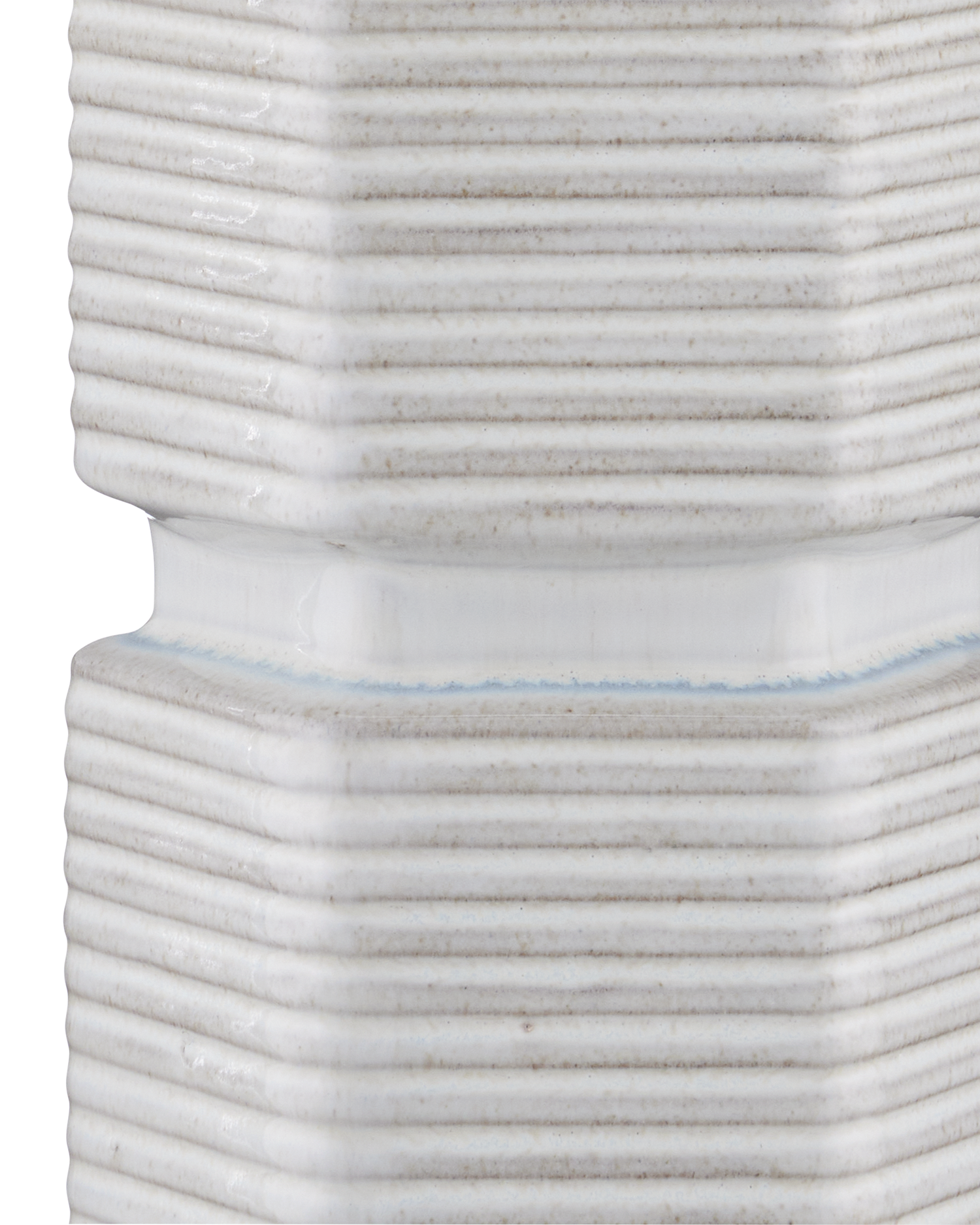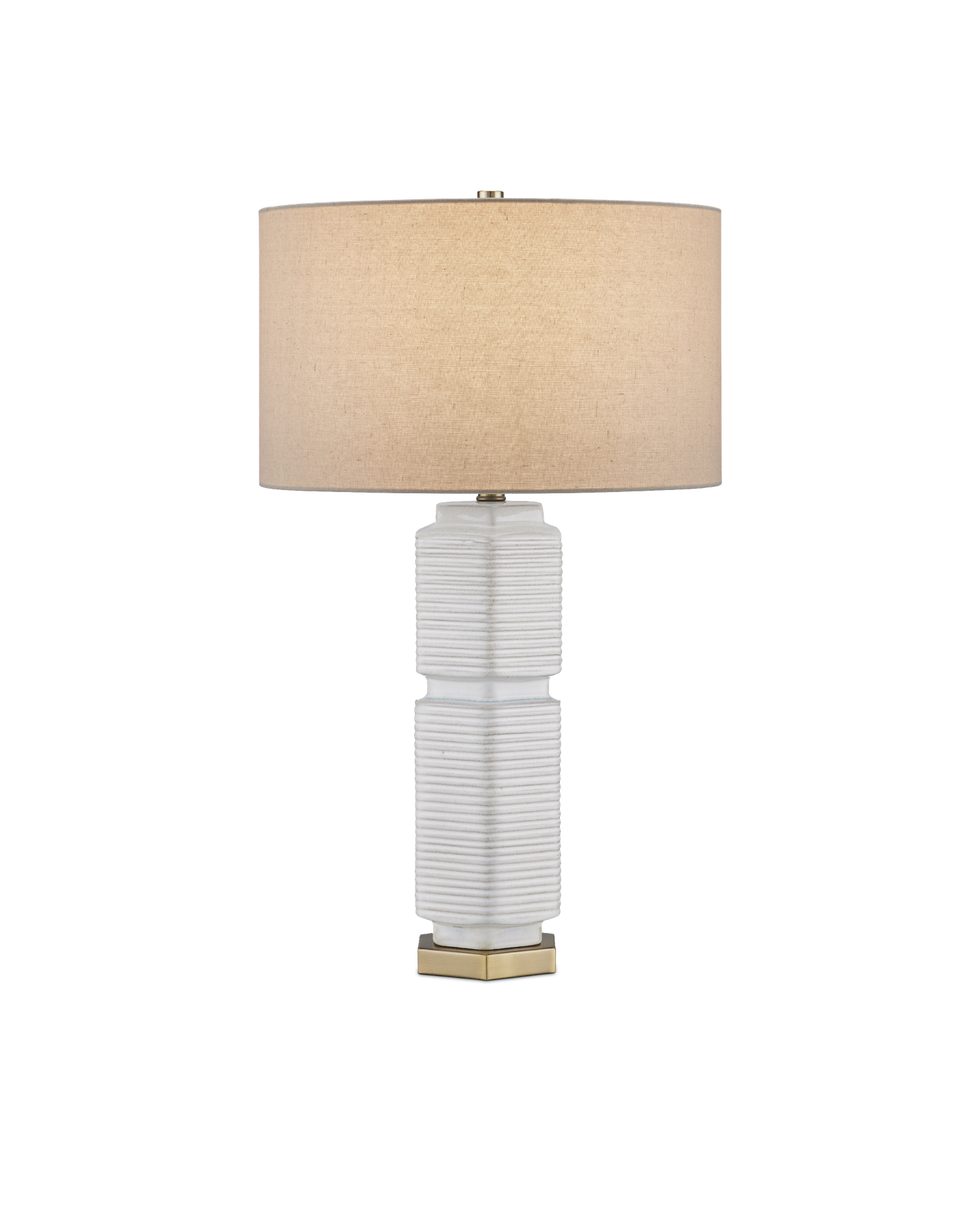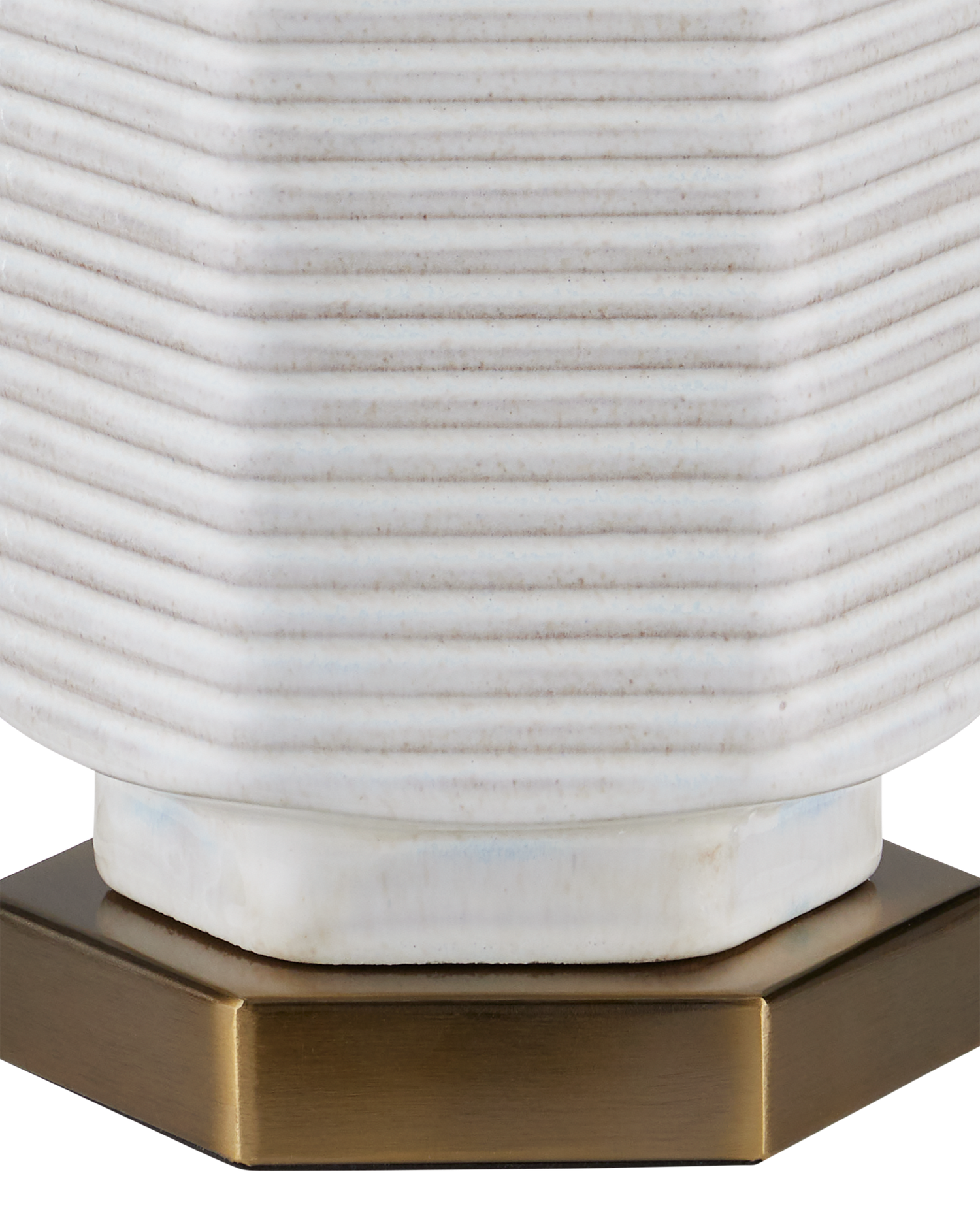 Description: The Glebe Table Lamp has a hexagonal shape made of ceramic with a white glaze withvery subtle hints of beige and blue. The geometric complexity of this white lamp is heightened by the striated lines pressed into it and the indentions at the base, near its center, and as the body meets the hardware at the top. The base, hardware, and finial in an antique brass finish are warm elements to the design, as is the textural shade.