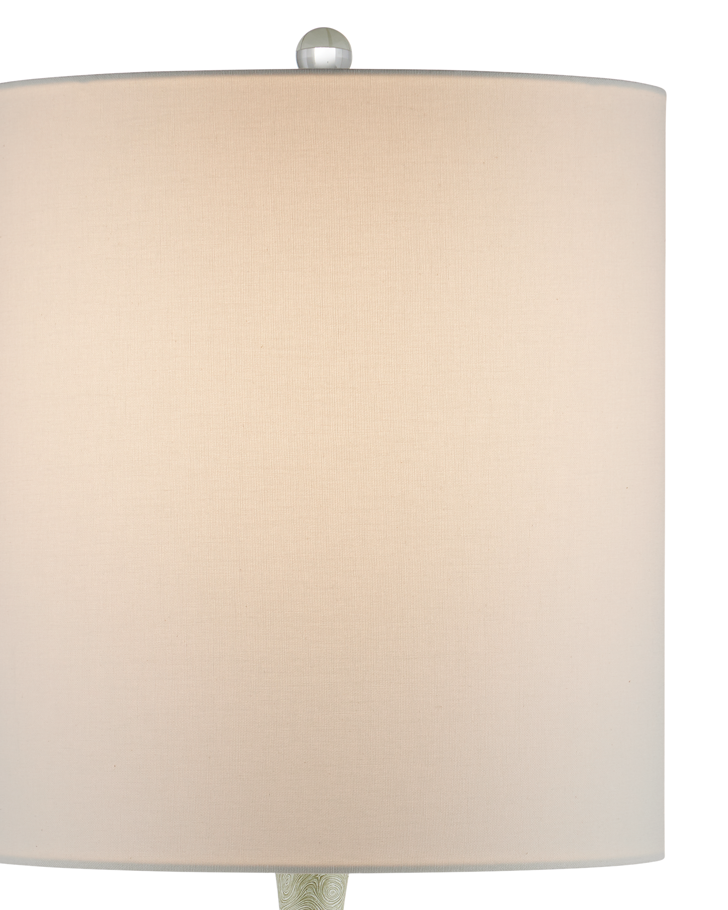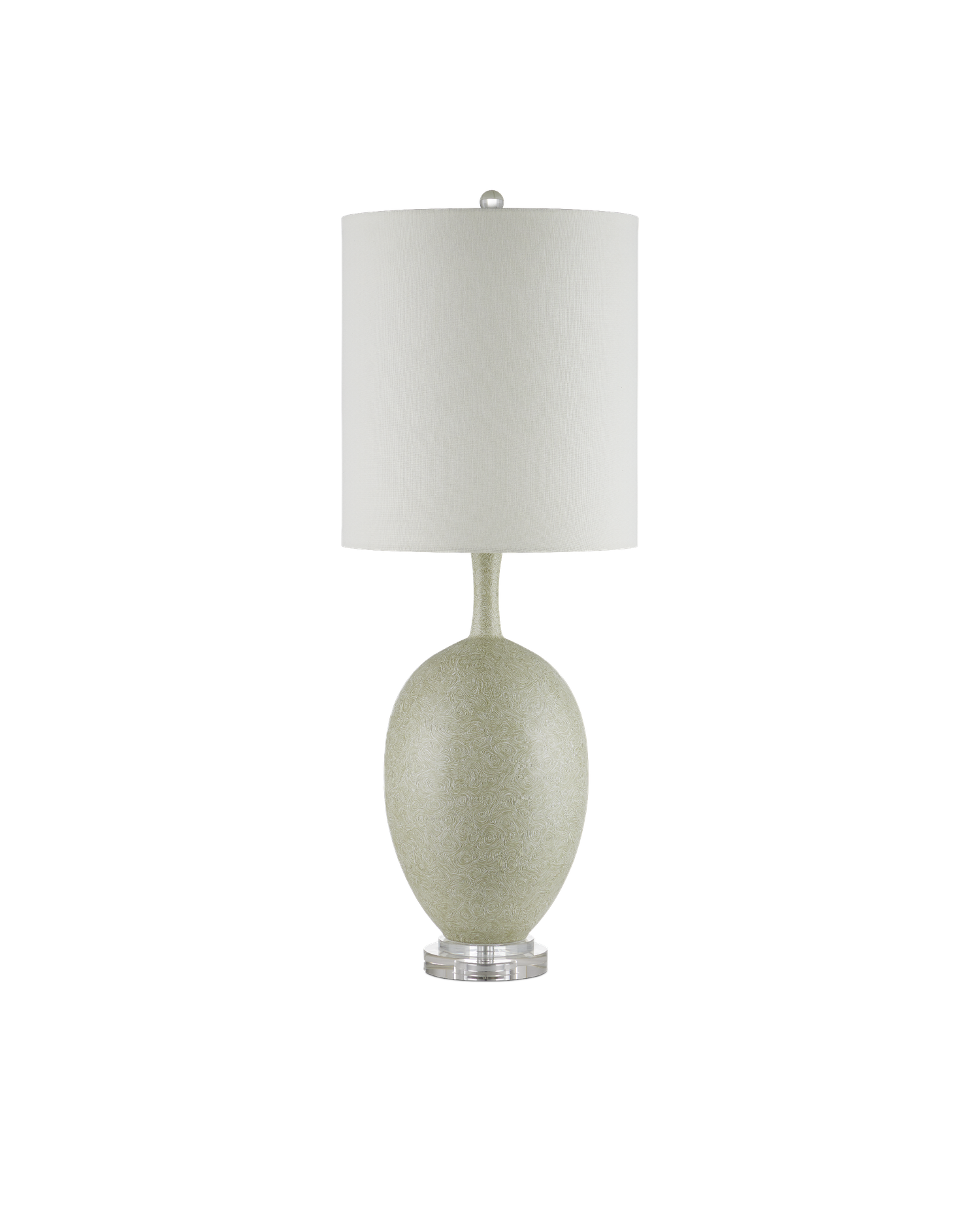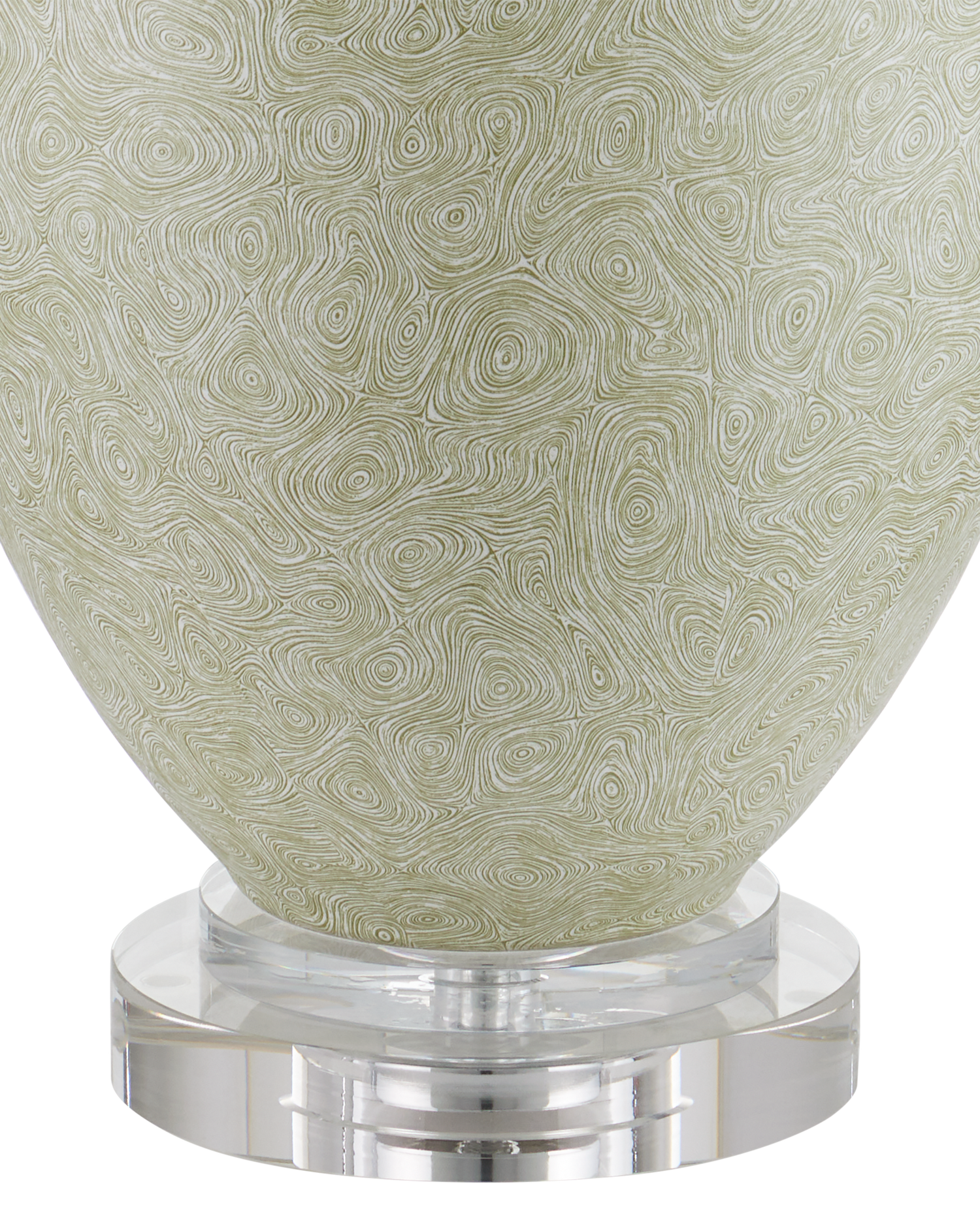 Description: The Verdure Table Lamp has a sophisticated vase-shaped body with a swirling green and white pattern on its surface, which recedes to a lovely stippled effect when seen from far away. The interlocking amoeba shapes only appear when one draws near the green porcelain table lamp. The thin mouth of the body sitting atop an egg shape disappears under an elongated shade. The base and finial are made of optic crystal.