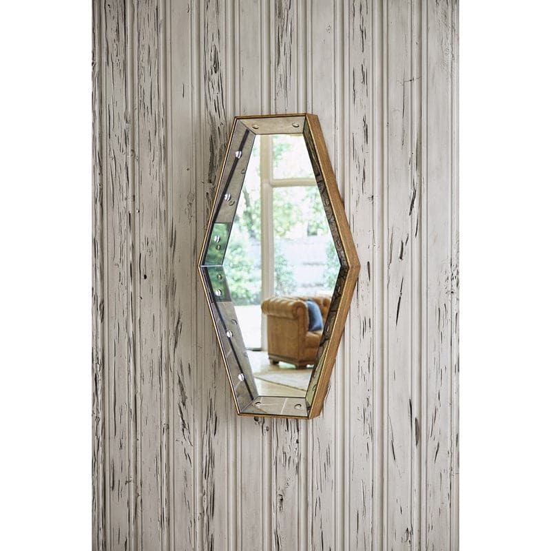 Made of MDF and solid wood with an antique gold finish. Inner frame is antique mirror with carved bull's eyes. Center is clear mirror.